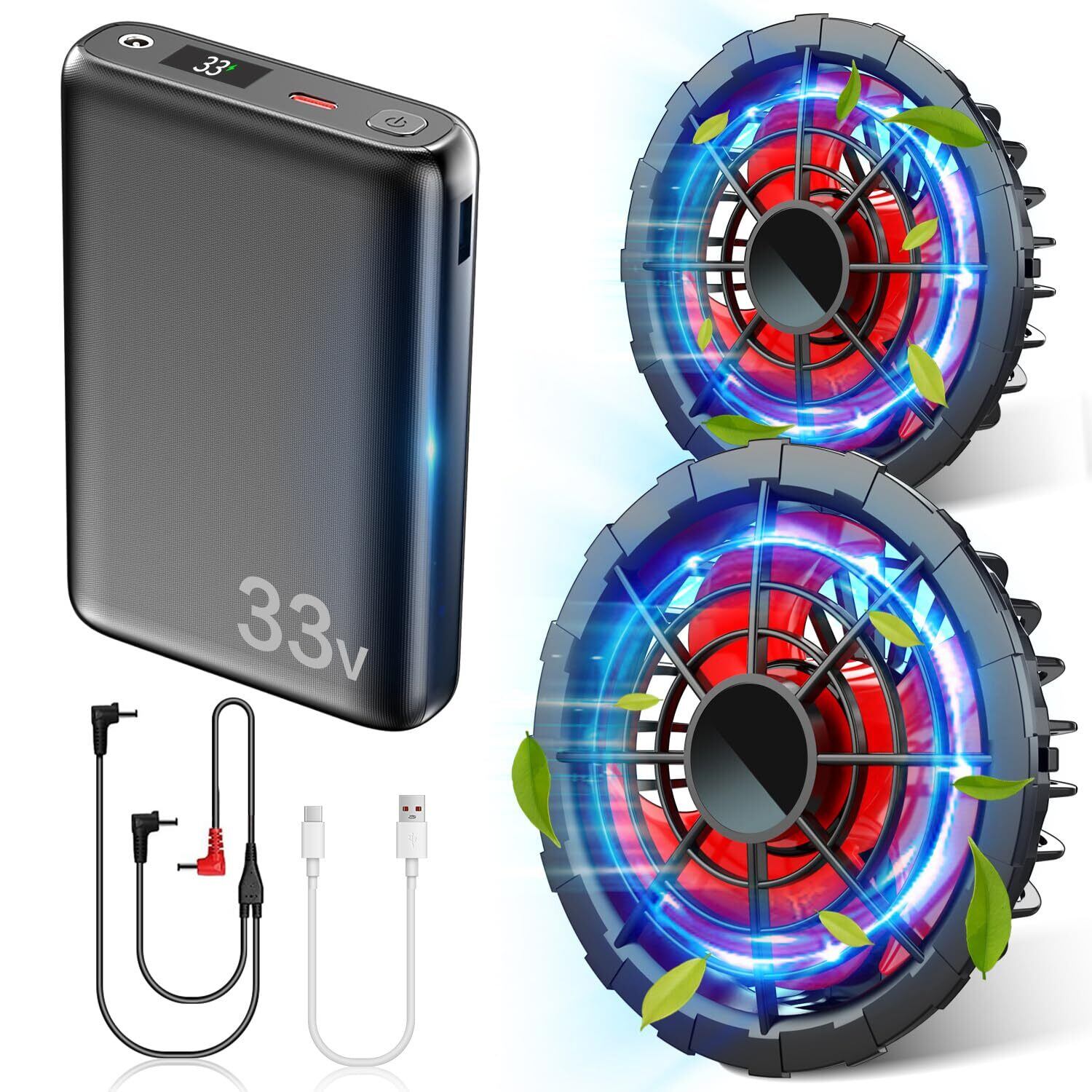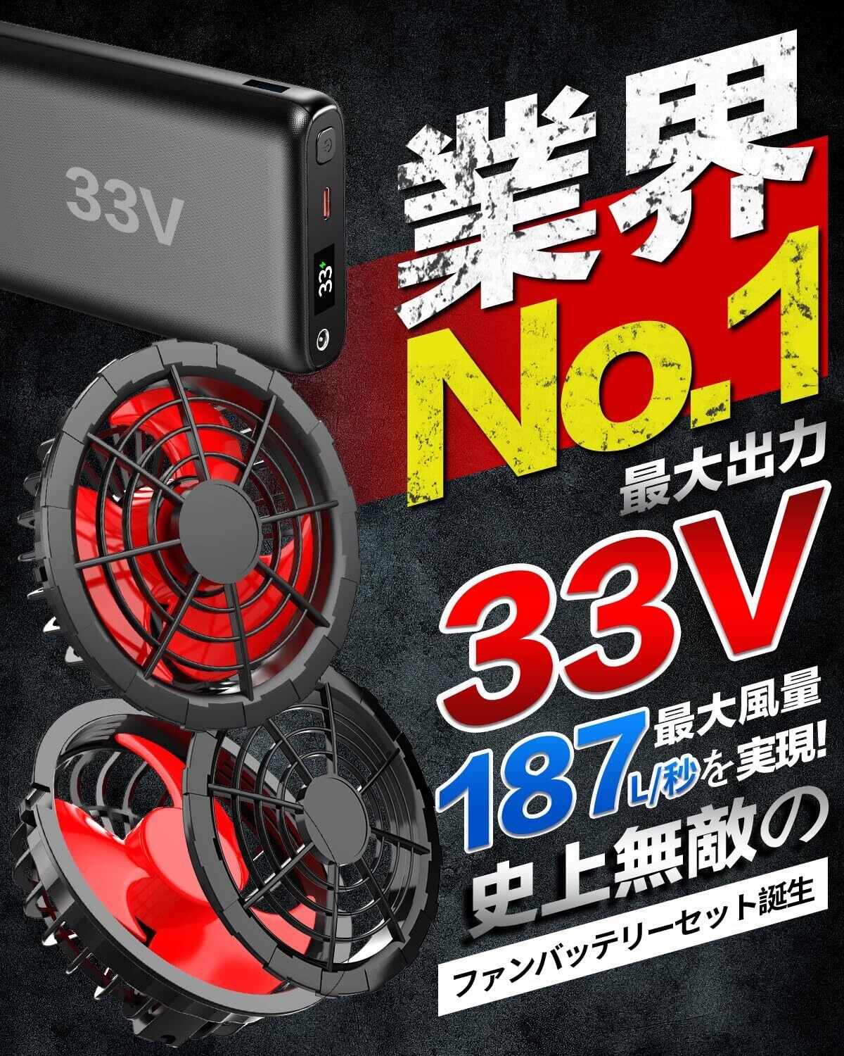 【2025業界超強・33V超高出力ファンバッテリーセット】2025年新作の熱中症対策、33V 超高出力ファンバッテリーセットが登場!従来のファン付きの作業服に取り付けて使用が可能です。ファンバッテリーセットの電源ボタンを押すと、大量の新鮮な空気が服の中を迅速に循環し、服内の汗を素早く乾燥し、蒸し暑い空気を排出し、心地よい感覚を生み出して、圧倒的な涼しさを実現します。パワーが安定で、風量が弱くならないでずっと187ℓ/秒で服内に暴風を送ります。お手持ちのファン付き作業服に取付可能で、レベルアップが可能です。