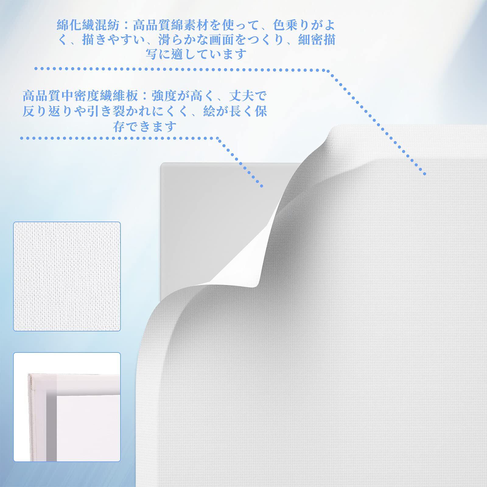 【優れる綿化繊混紡】素材は綿・化繊の高品質素材を素材を採用しております、麻張キャンバスに比べ目が均一できれいです。キャンバスは中目、油彩・アクリル兼用、さまざまな絵具に対する吸収性にすぐれ、引き裂きにくく、塗料が漏れ防止可能。亜麻に比べ繊細な綿は、滑らかな画面をつくり、細密描写に適しています。アクリル絵具・油絵の具を使って本格的な絵の世界を表現出来る!