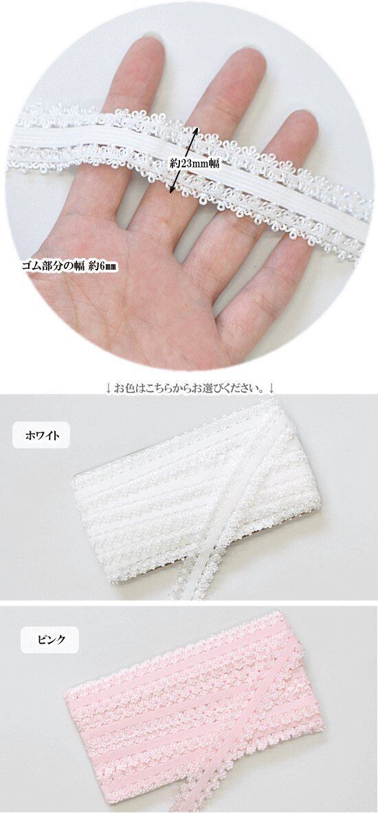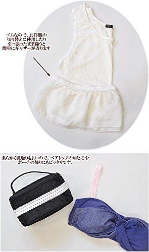 ふんわりで肌触りのよい、レースが両端についたゴム。 お洋服の切り替え部分やゴムを伸ばしたまま縫うとギャザーになります。 インナーの端に付けても、可愛らしい印象に。 ヘアアクセサリーやポーチや小物のアクセント、お子様のお洋服 衣装やドレスなどにもオススメです