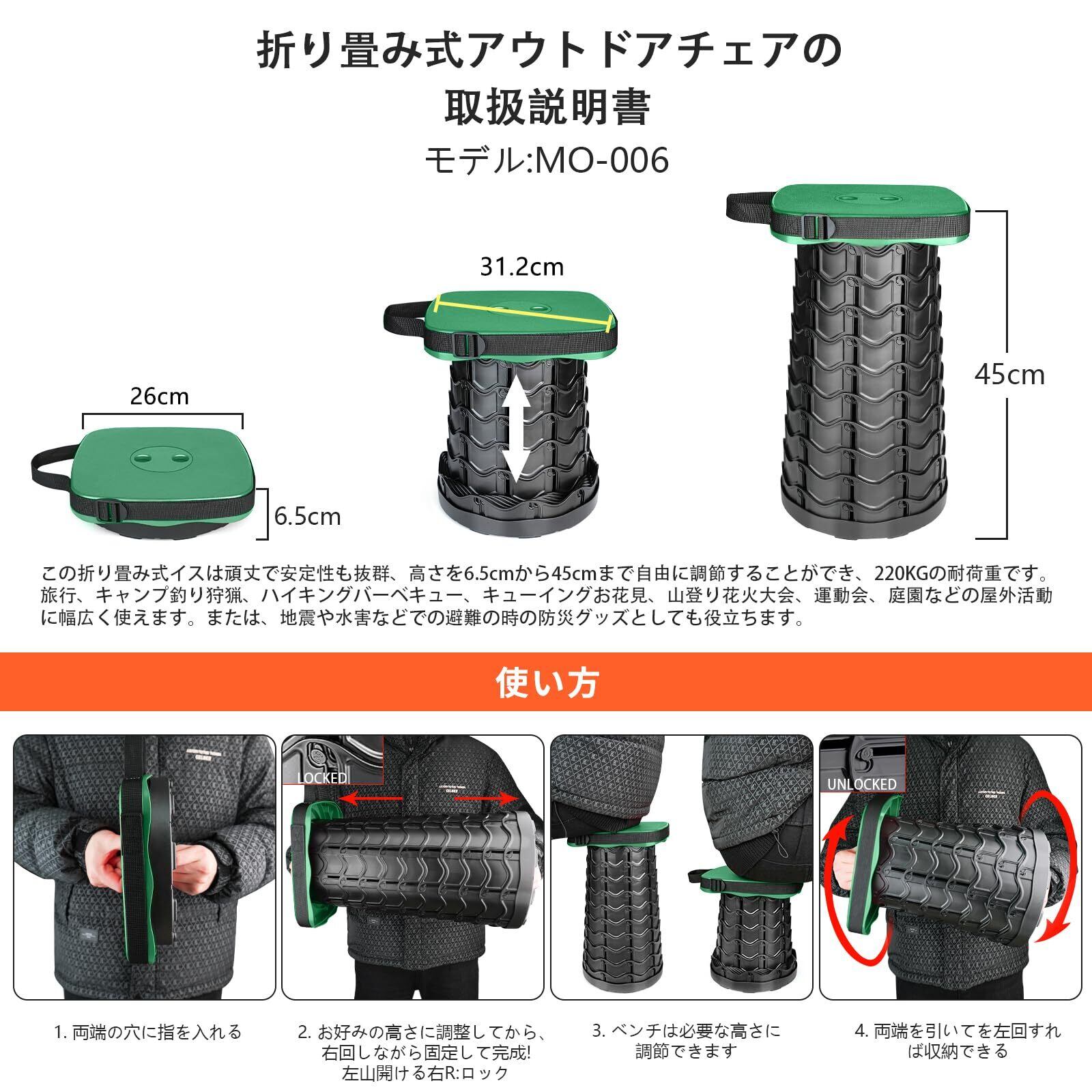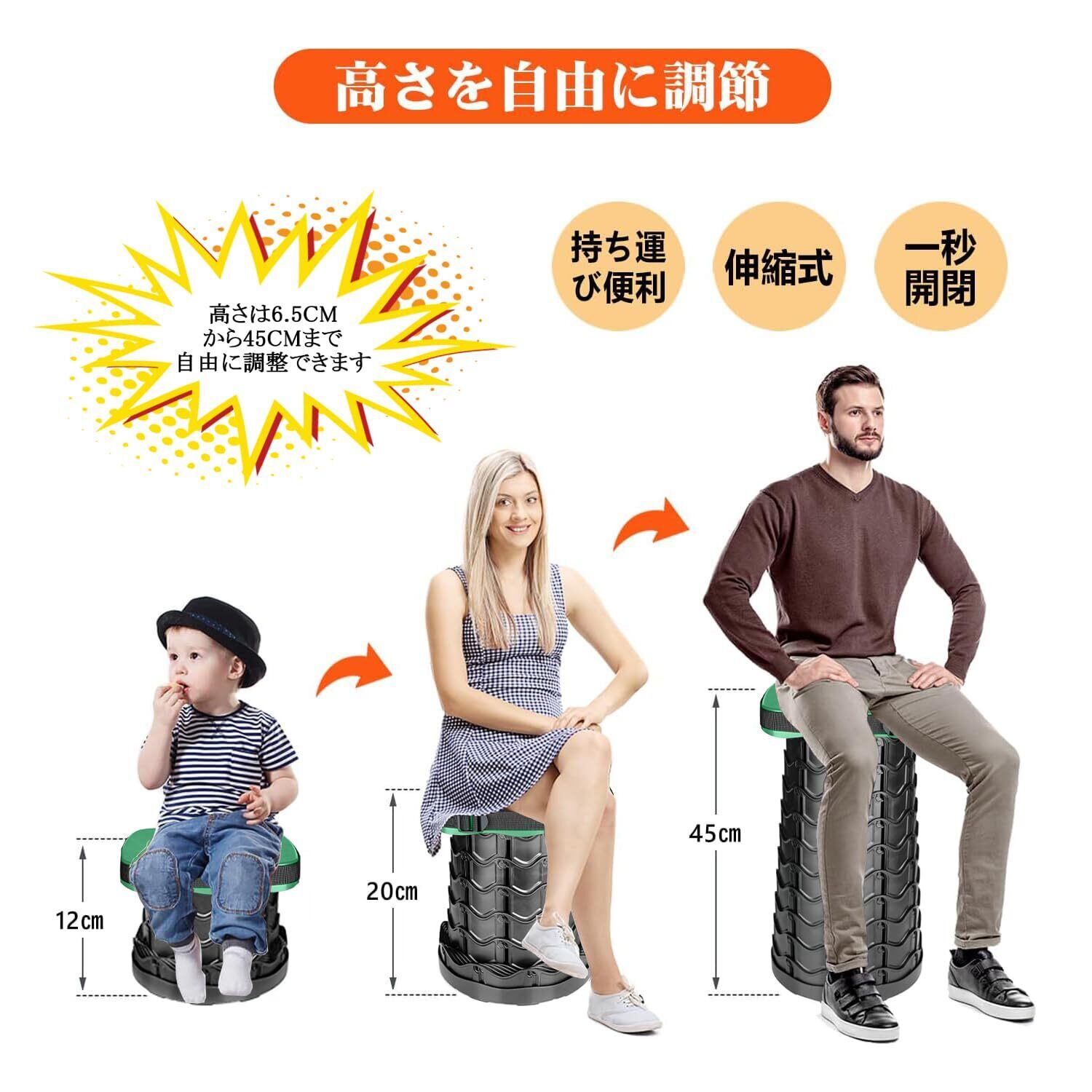 使用簡単:折りたたみ式椅子なので、即に開閉可能です。6.5cmから45cmまで12段の高さに設置されており、子供にも使えます
