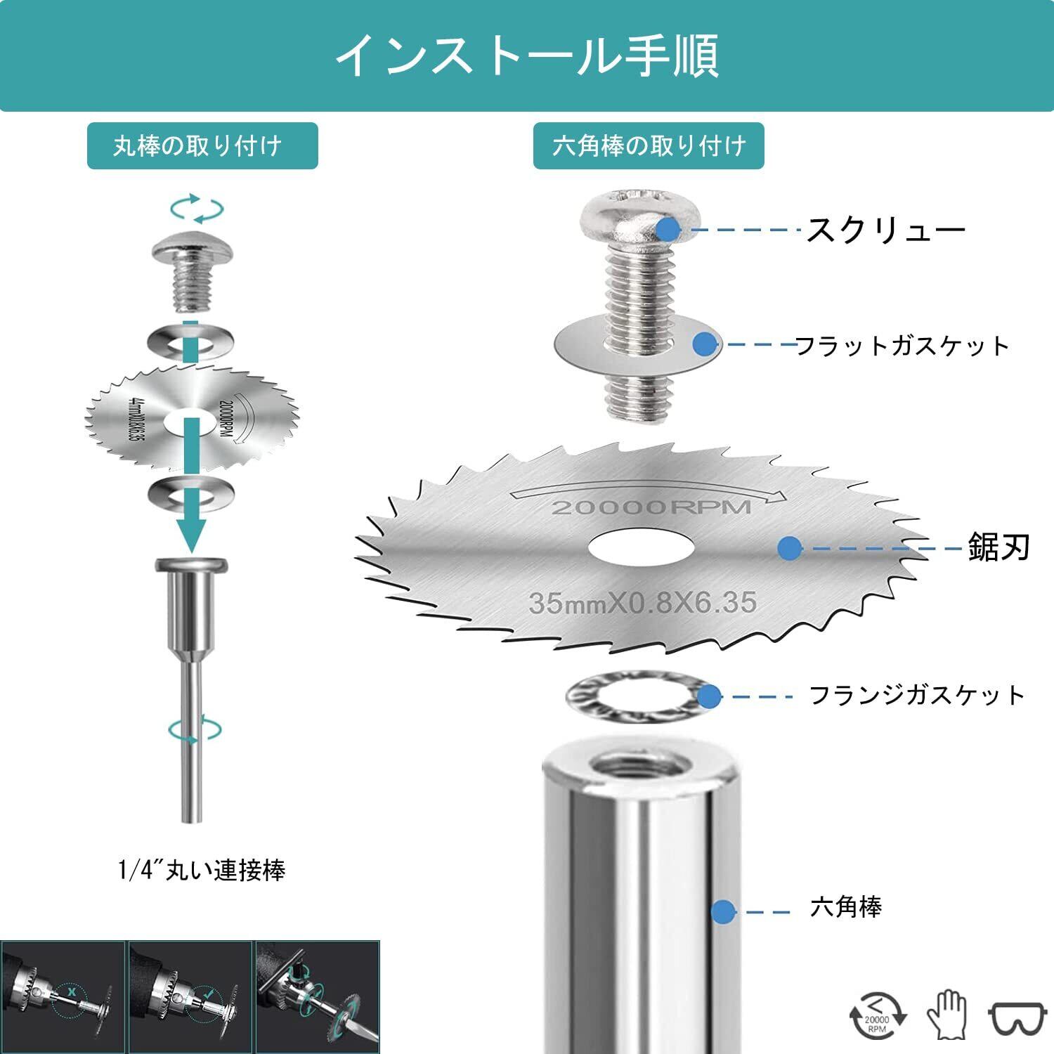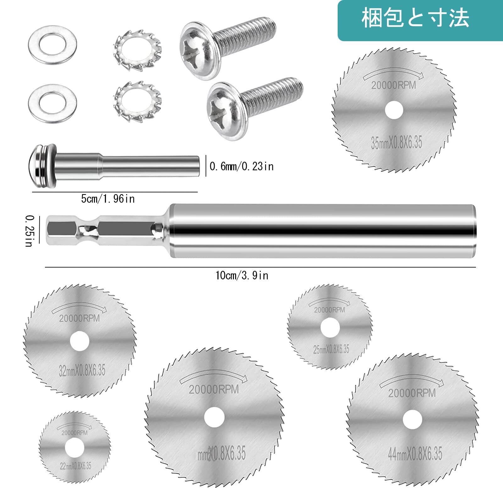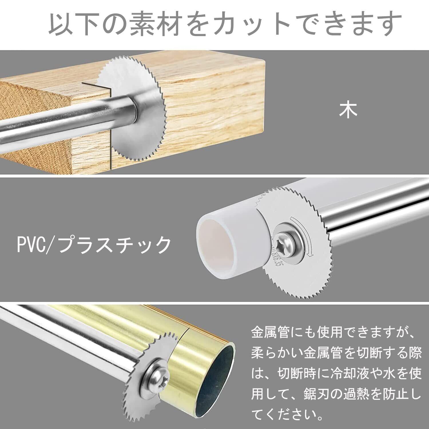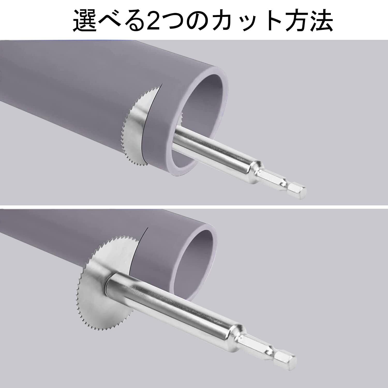 パッケージ内容: パイプカッターセット、6.35mm六角コンロッド1本、6mmハイスピードコンロッド1本、径の異なる鋸刃6枚、各1枚(0.87インチの、0.98インチの、1.25インチの、1.37インチの、1.73インチの、1.96インチの)と2セットのネジ締結具を備えている。鋸刃を保護ために、鋸の刃には保護油が積まれて、気にしないで