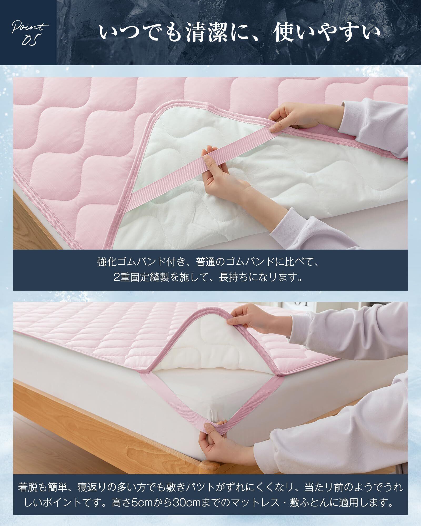 【ゴム付き・丸洗いOK】敷パッドの四隅に強化ゴムバンドが付いているので、敷きパッド を布団にしっかり固定できます。お洗濯の際の取り外し&取り付けも簡単なので、家事の負担も軽減してくれます。ご家庭で簡単に洗濯することができていつも清潔を保つことができます。乾き易くて毎日快適に使えます。 ※1.洗濯機で洗濯や脱水する場合、ネットで使ってください。2.乾燥機をご使わないでください。3.洗濯の際、変色や脱色のおそれがありますので、塩素系漂白剤のご使用はお避け下さい。