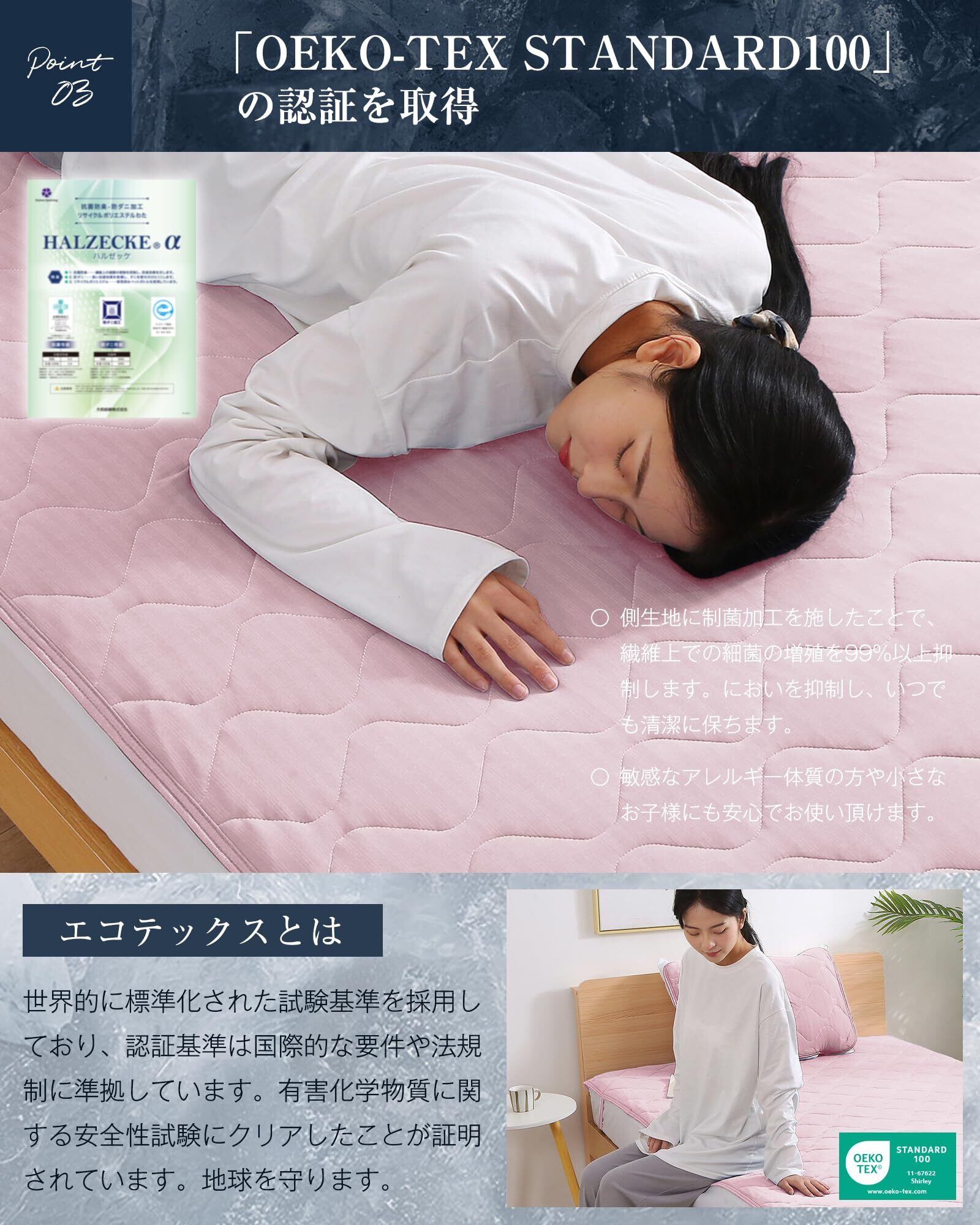 【抗菌防臭防ダニ】側生地に制菌加工を施したことで、繊維上での細菌の増殖を99%以上抑制します。お洗濯をしても汗や皮脂を細菌が食べ、その細菌が排出した老廃物がいやなニオイのもとになります、そのニオイの原因菌を減らすことで、根本からニオイ問題を解決できます。抗菌防臭加工済で、細菌の増殖を防ぎ、においを抑制し、いつでも清潔に保ちます。SEK認証された優れた抗菌防臭効果で、敏感なアレルギー体質の方や小さなお子様にも安心でお使い頂けます。