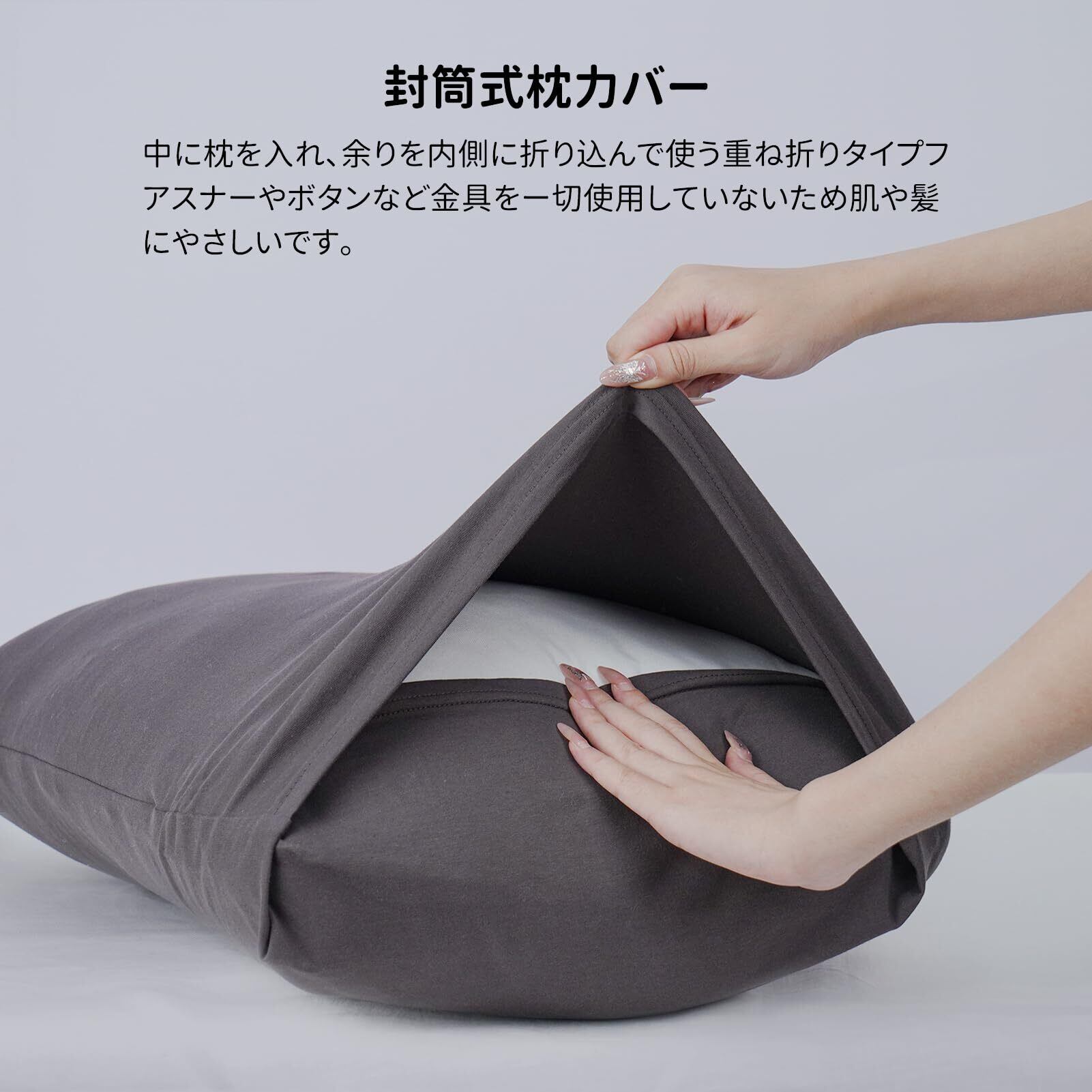 【顔や髪が喜ぶ 封筒式枕カバー】 中に枕を入れ、余りを内側に折り込んで使う重ね折りタイプです。まくらの両サイドまでしっかり包みこみ、汚れなどを防ぐことができます。ファスナーやボタンなど金具を一切使用していないため肌や髪にやさしい。洗濯時のピローケースの取り付け・取り外しも楽チンになっています。