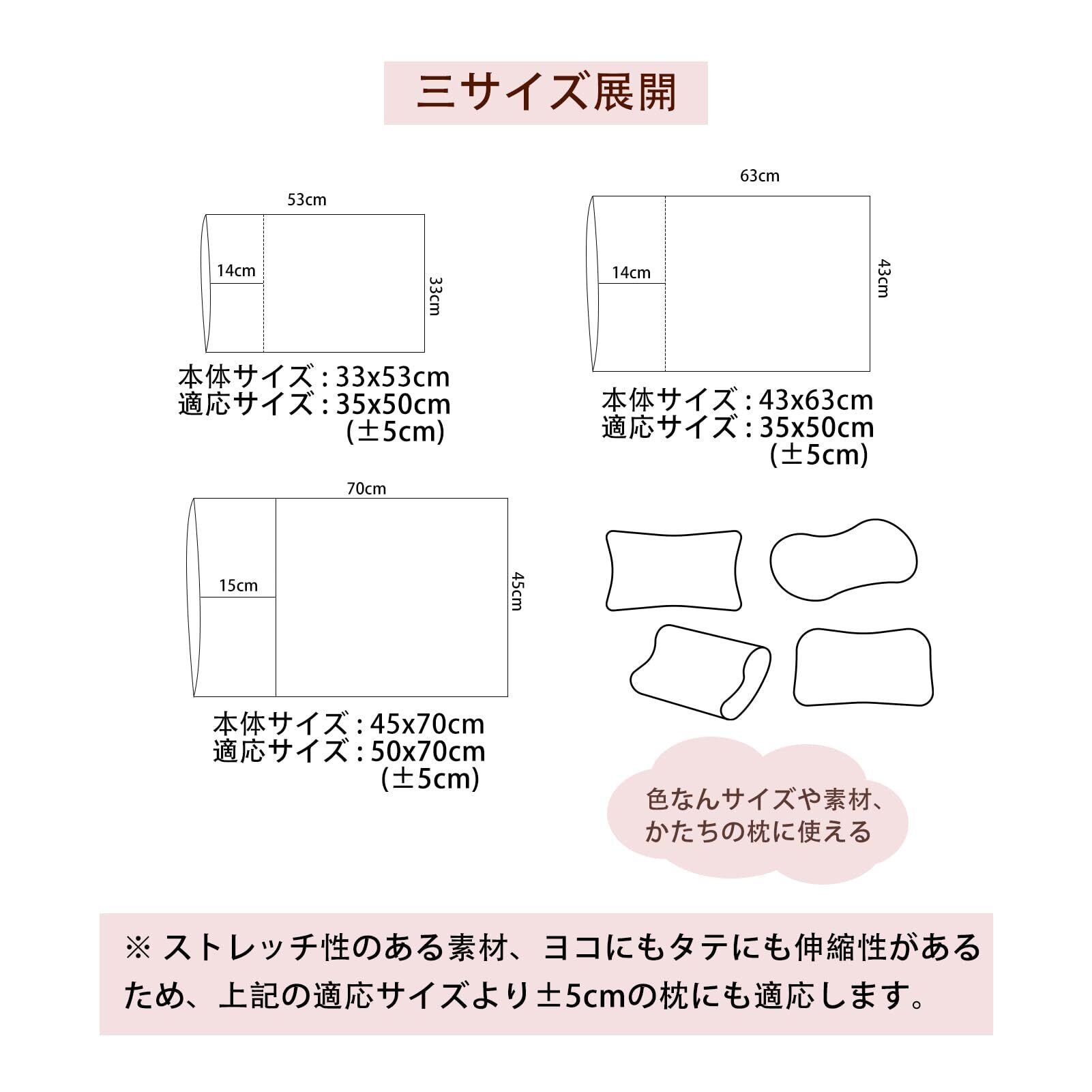 【枕のサイズや形を選ばないのびのび枕カバー】伸縮性を出すためにポリウレタンを8%ミックスして丁寧に織り上げたのびのびまくらカバー。多彩なサイズ、かたちの枕にズレずにピッタリフィットします。上下左右どの方向にものびやすく、全体が伸縮するまくらカバーなので、波型まくらや、特殊な形状の低反発枕などにもお使いいただけます。3サイズ展開しております。 標準サイズはもちろん、標準よりも±5cmのまくらにも適応します。A.枕カバー本体サイズ:(幅)33cm×(長さ)53cm。【適応サイズ】30×50㎝、35×50㎝、35×55㎝など。 組成:綿92%+ポリウレタン8%