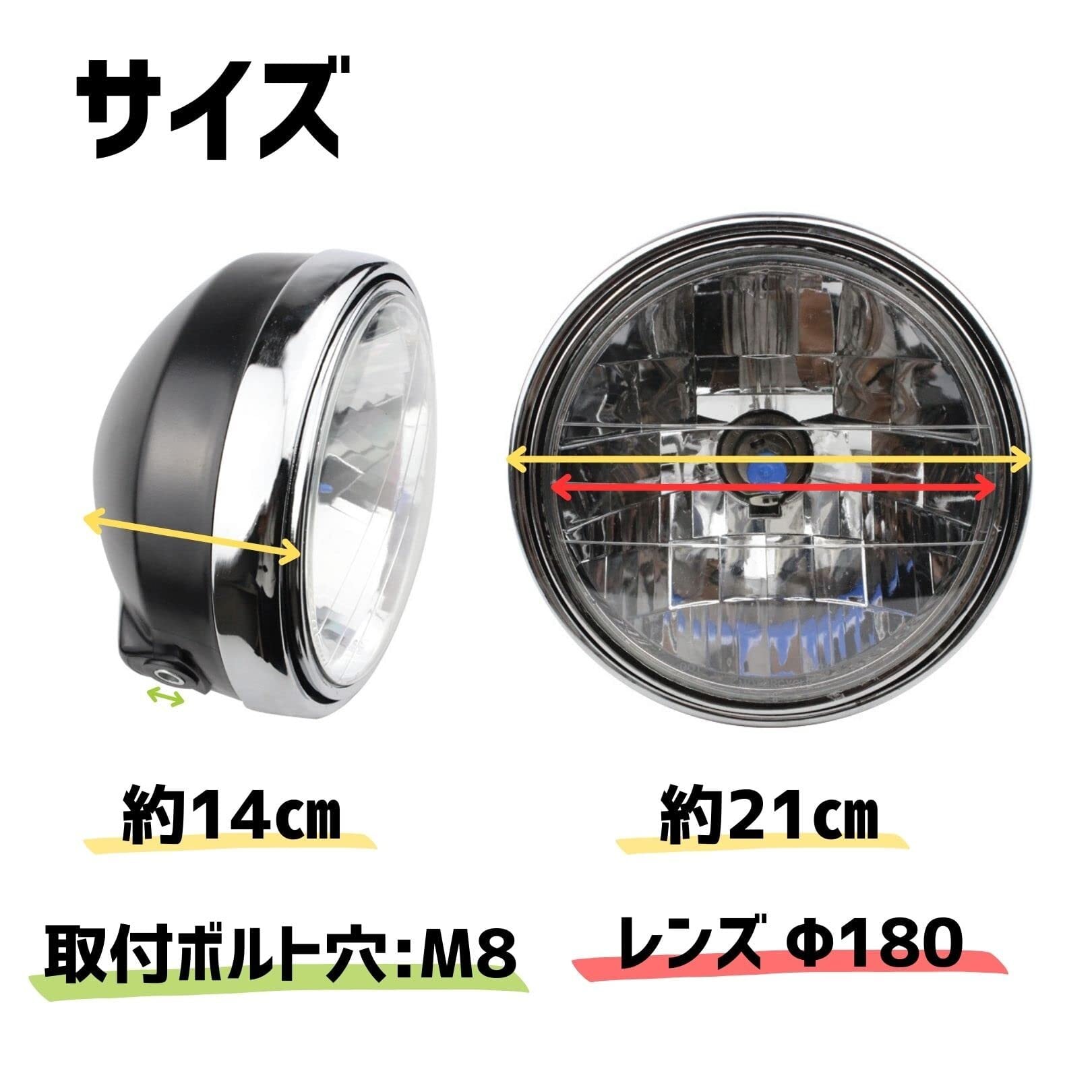 全体サイズ: 直径 約 21cm 奥行き 約 14 cm / 取り付け部ボルト穴:M8 レンズ径:180パイ