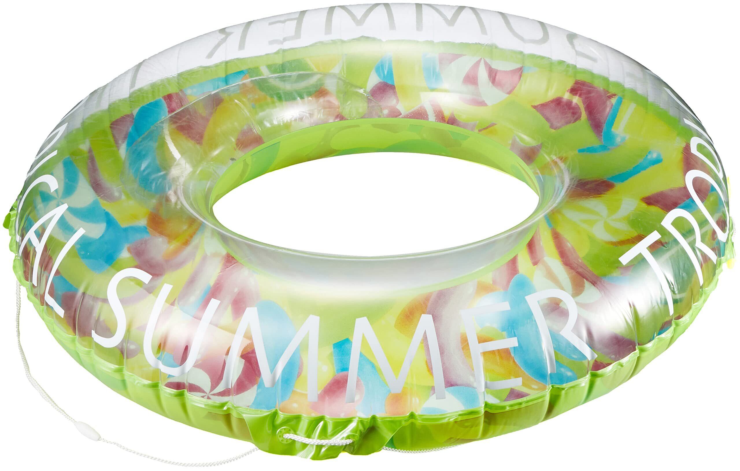 膨らんだ状態の浮輪の内周が約165〜170センチとかなり大きめな浮輪です。大人が二人余裕で入れるほどの大きさです。かんたん空気栓装着商品。ロープ付
