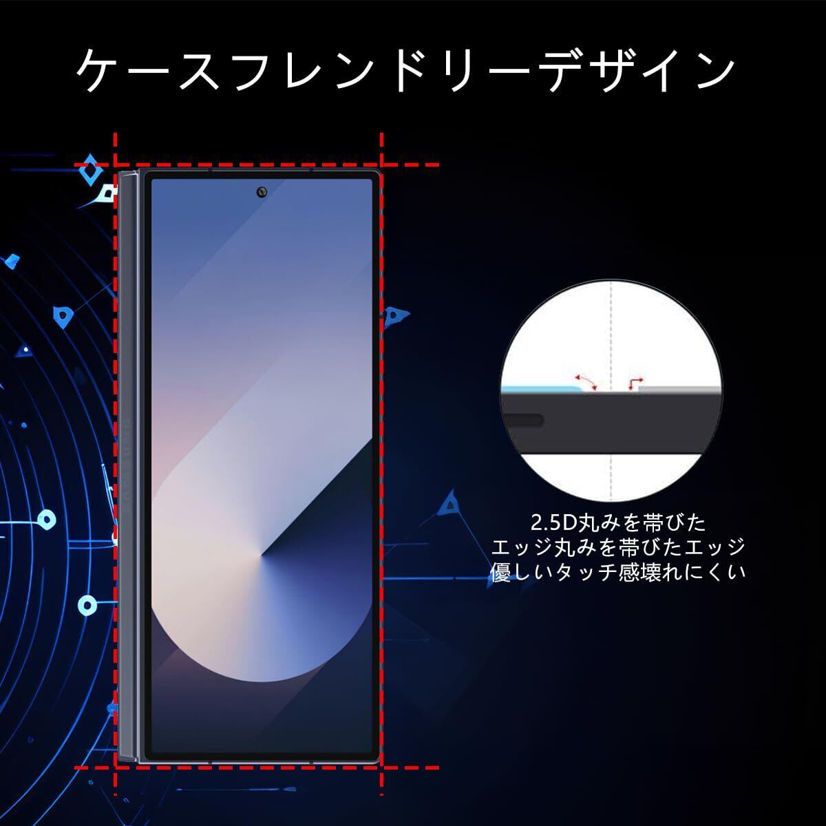 【99%以上のケースに干渉せず】数多くのデザインのケースの装着実験して、99%以上のケースとの相性が良い。ケースのデザインには個体差もあるので、装着する瞬間フィルムの四角が少し浮いてる可能性がありますが、布を指に包んで軽く押し出したら浮きが消え、綺麗に貼れます。