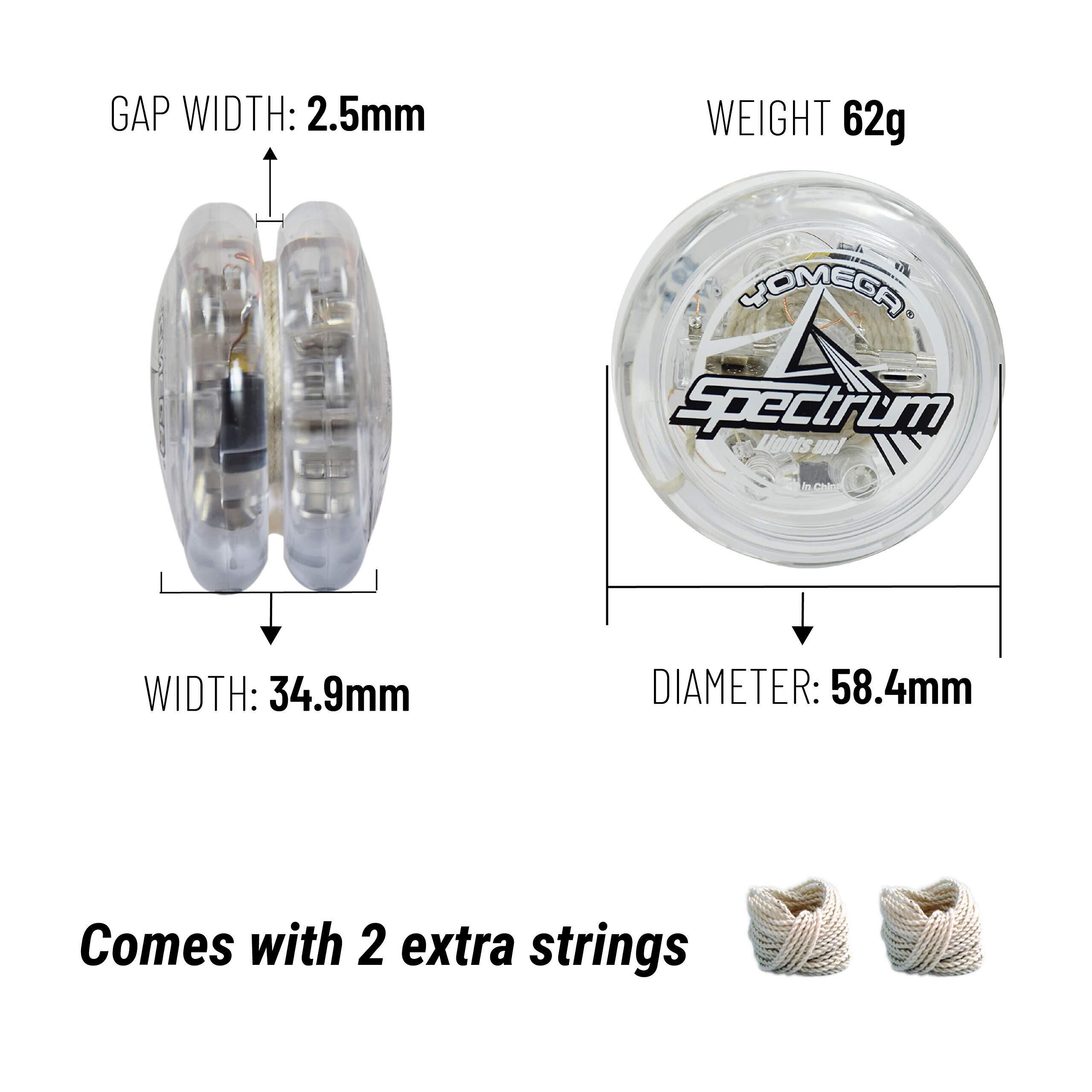 高性能トランスアクセルヨーヨー:トランスアクセルは、軸に付いているプラスチック製のスリーブまたはスプールで、長く滑らかなスピンを可能にします。 プレイヤーが手首をスナップすると、Spectrumは糸の先端で回転します。 手首をもう1回スナップすると、Spectrumは手元に戻ります。
