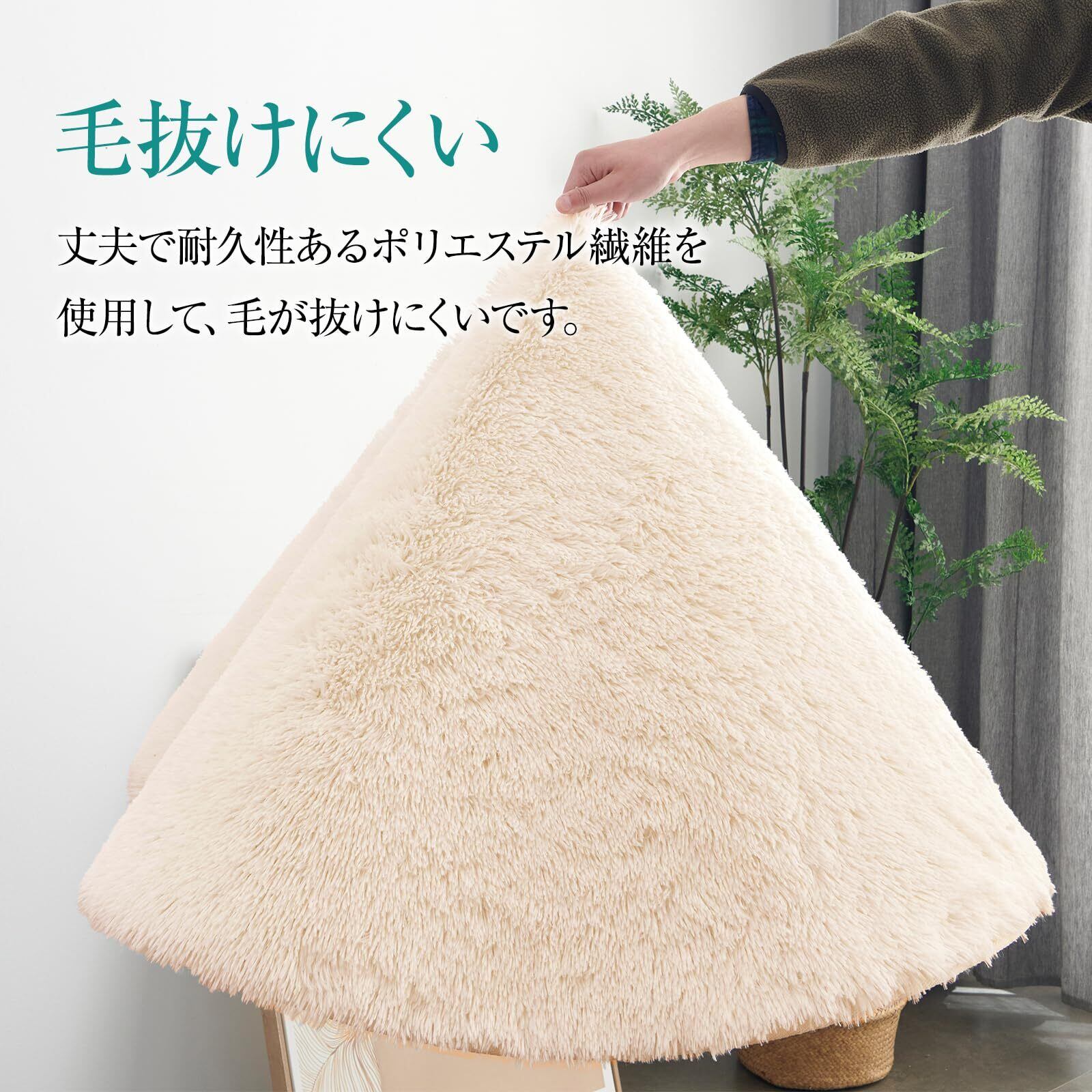 【商品仕様】サイズ:直径約120cm 表地:ポリエステル100% 中材:ウレタンフォーム 裏地:ポリエステル100%。 起毛の高さ:約35mm、ウレタン厚:約10mm、不織布と滑り止め加工は約2mm、合計厚さ約45mmです。