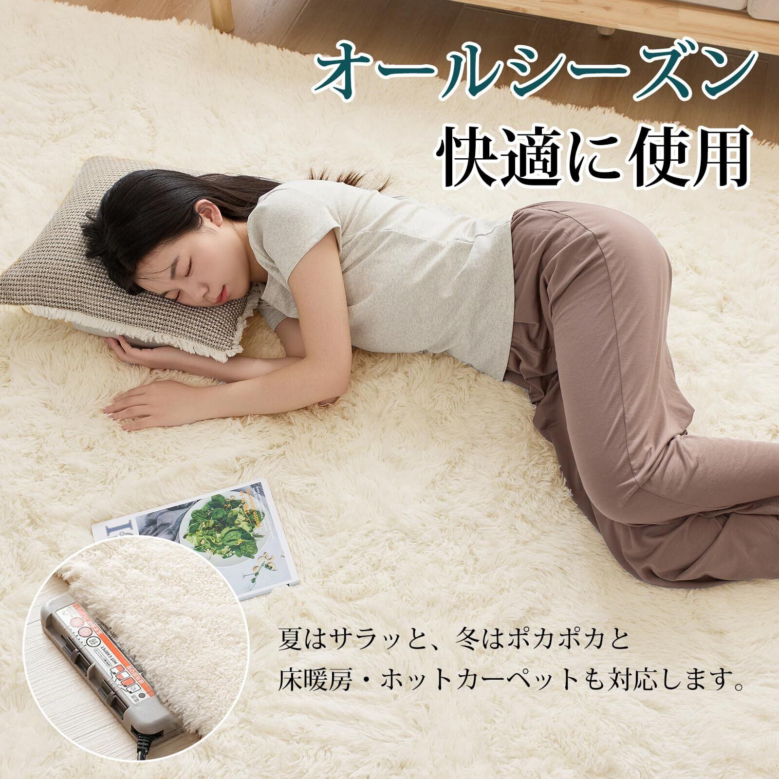 【オールシーズンカーペット】このラグの毛足は、通気性が良く、速乾性にも優れたマイクロファイバーを採用し、踏み心地は柔らかい、夏はサラッと快適に、冷房機器との併用で快適に過ごせます。耐熱加工を施しているので冬はホットカーペットや床暖房の上に敷いてもお使いでき、フワフワと暖かく、居心地がよくなります。