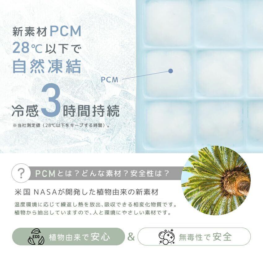 【PCM素材&安全性】 PCMはNASAが開発した特別な温度調整が可能な植物由来の新素材です。温度環境に応じて繰り返し熱を放出、吸収できる相変化物質です。 植物から抽出していますので、人と環境にやさしいエコな安心&無毒性で安全です。防菌・防臭で肌に優しく、子供から大人まで幅広くご使用いただけます。 PCM素材は28℃以下で自然凍結し、繰り返し使用することができ訂正温度を維持します。また融解すると熱エネルギーを吸収し凝固する際に熱エネルギーを放出する仕組みで持続的な冷感効果をもたらす特徴があります。環境温度30℃で28℃以下をキープする場合は凍結を4時間持続することが可能です。 一定の温度で自然凍結し持続性があり、生分解し自然へ循環可能、長期間仕様が可能でお得といったメリットがあります。