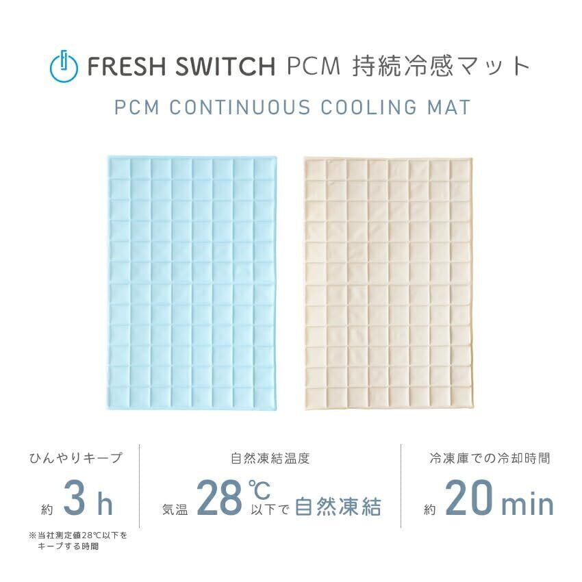 PCM持続冷感マット は冷却グッズであるクールベスト、PCM冷却ベスト、アイスキャップ、冷感マット、冷感シート、ネックリング、冷感寝具のタオルケットやパッドと同じPCM素材を使用しています。 ネックファン、ネッククーラー、ハンディファン、ファン付ベストとは異なり、充電が不要でエコでお手軽に長くご使用いただけます。結露しにくく様々な環境にぴったりの快適な付け心地になっています。国際規格COSMOSと国際規則REACH認証取得し世界基準の品質保証のもとFRESH SWITCHは作られています。