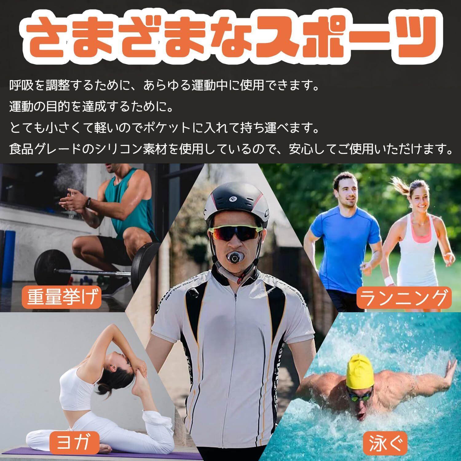 【呼吸筋トレーニング】:呼吸筋(横隔膜、補助関節など)を鍛えることができます。腹式呼吸をサポートするので、自然と腹式呼吸にフィットする。呼吸筋のトレーニングを続けると横隔膜の厚みが変わってきます。呼吸の質を高めることで、大量の酸素を筋肉に送り込むことができ、持久力を高めることができる。
