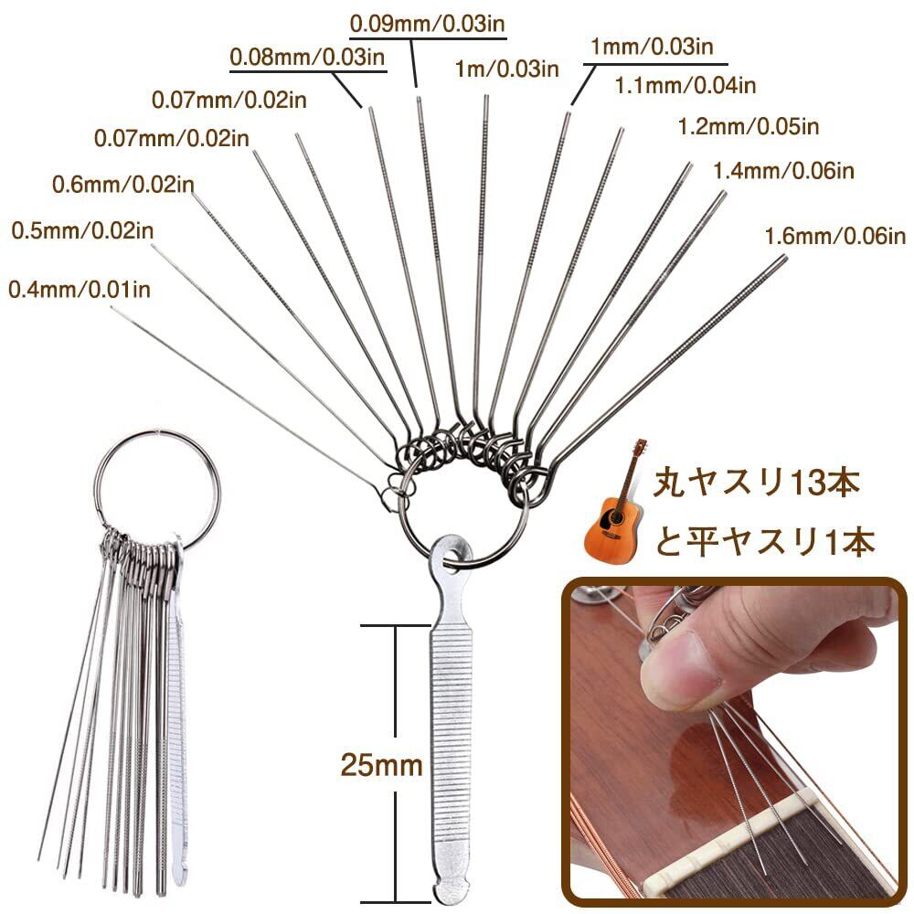 ギター研磨用ヤスリ 0.4 mm / 0.5 mm / 0.6 mm / 0.7 mm / 0.75 mm / 0.8 mm / 0.9 mm / 1.0 mm / 1.05 mm / 1.1 mm / 1.2 mm / 1.4 mm / 1.6 mm、研磨長 25 mmの各種サイズがあります。