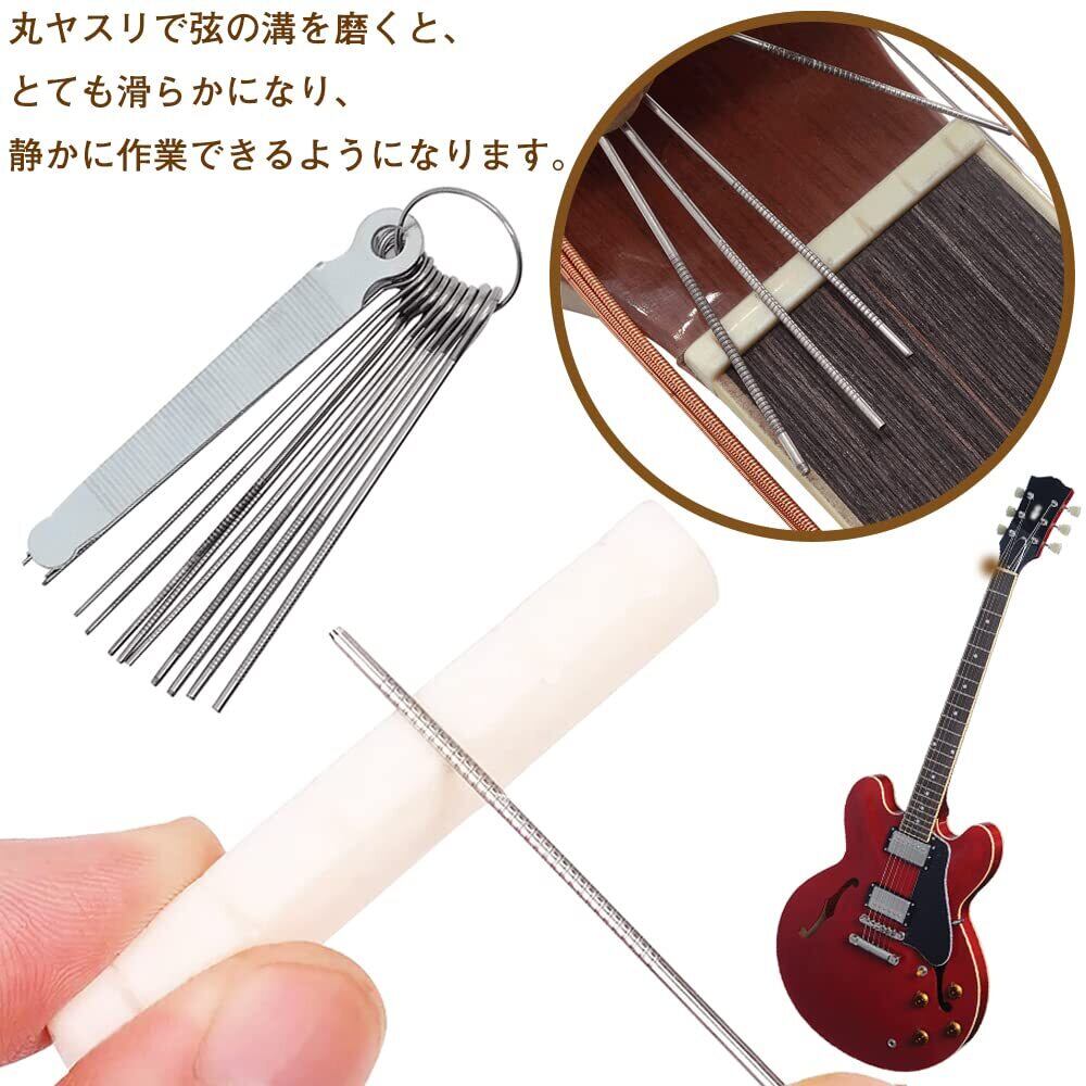 丸ヤスリは、弦の溝を研磨し、非常に滑らかにします。軸の長さを長くすることで、弦の溝をヤスリで削る際の取り回しを良くしています。動作音も非常に静かです。平ヤスリは、ナットやギターのブリッジの研磨に使用します。