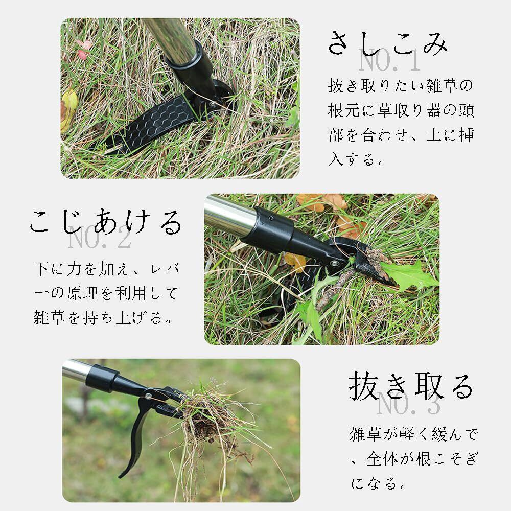【楽で省力】:雑草取り器具は100センチの長柄設計を採用し、立っているだけで簡単に雑草を引き抜くことができる。雑草の根元に爪を合わせ、足でペダルを踏み込み、雑草を抜いて放すだけ。長時間腰をかがめることなく、立っているだけで簡単に使用でき、芝生の手入れが簡単にできます。