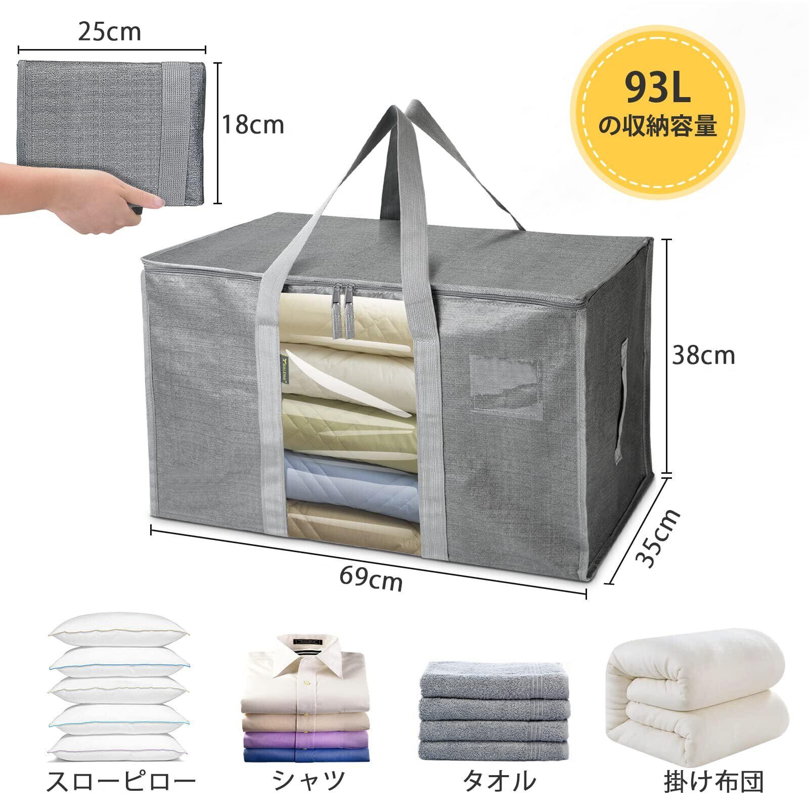大容量:この収納バッグは非常に大容量です。 サイズは長さ約69cm、幅35cm、高さ38cm、約93リットル収納可能です。 耐荷重は約20kgあるので大量の衣類やシーズンオフの寝具など大きな荷物も収納可能です。大型でありながら、使わない時は本のサイズまでコンパクトに折りたたむことができ、収納スペースを取りません。