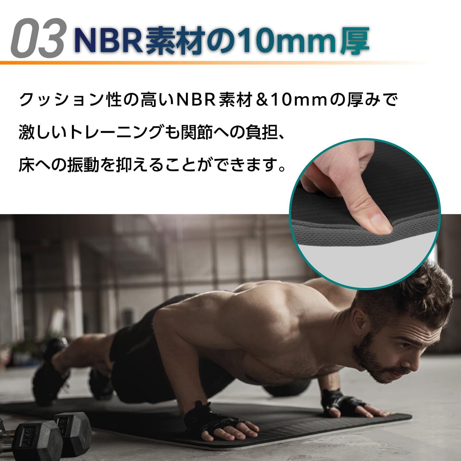 ・NBR素材の10mm厚クッション性の高いNBR素材&10mmの厚みで床への振動を抑えることができます。