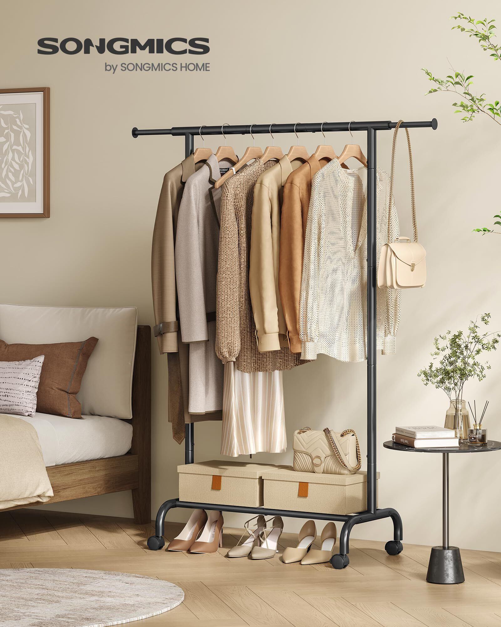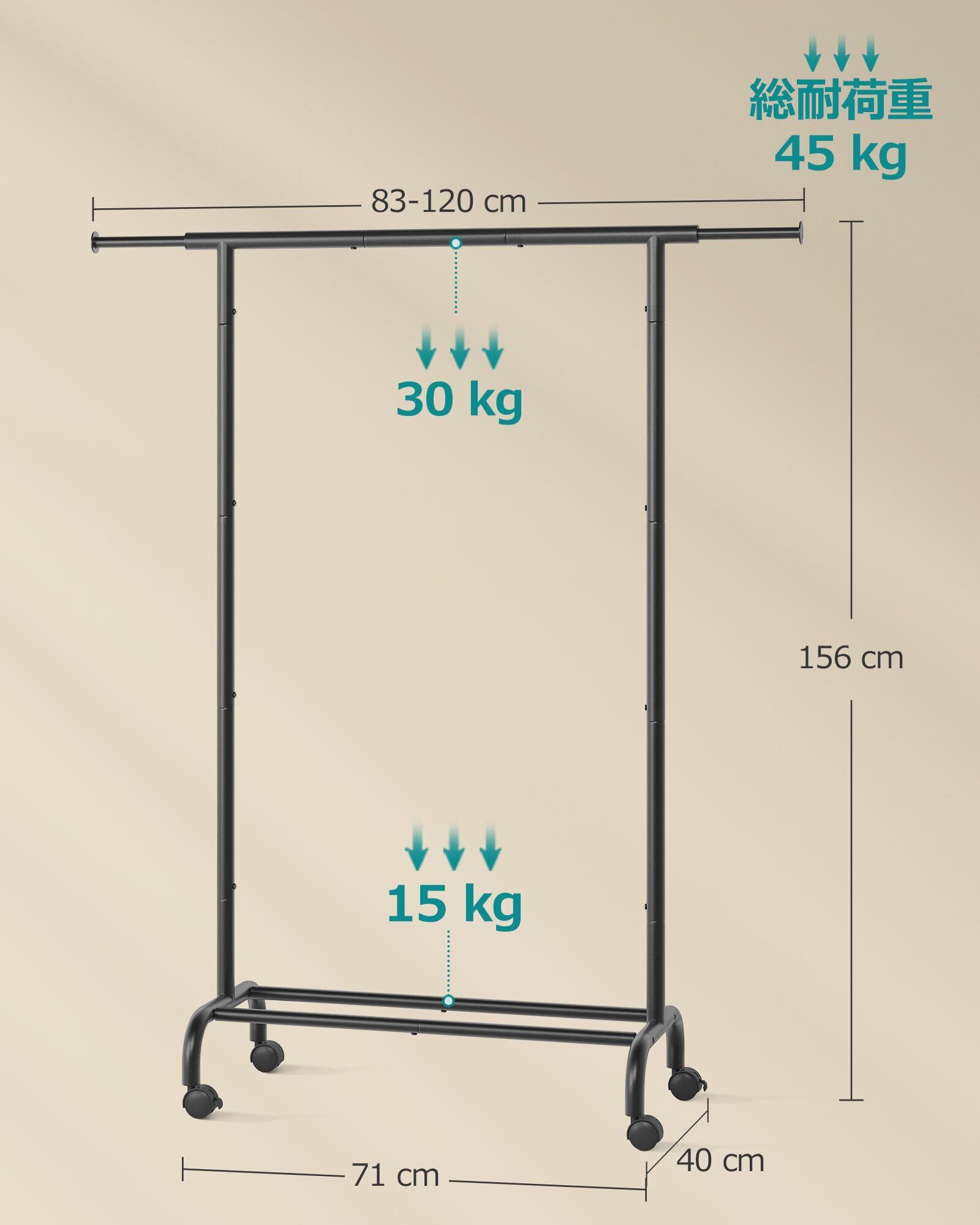SONGMICS ハンガーラック 伸縮式衣装ラック 頑丈 洋服掛け 幅84~120cm スリム 室内物干し 衣類収納 安定性 キャスター付き移動しやすい ちょうどいいサイズ ブラック HSR134B01