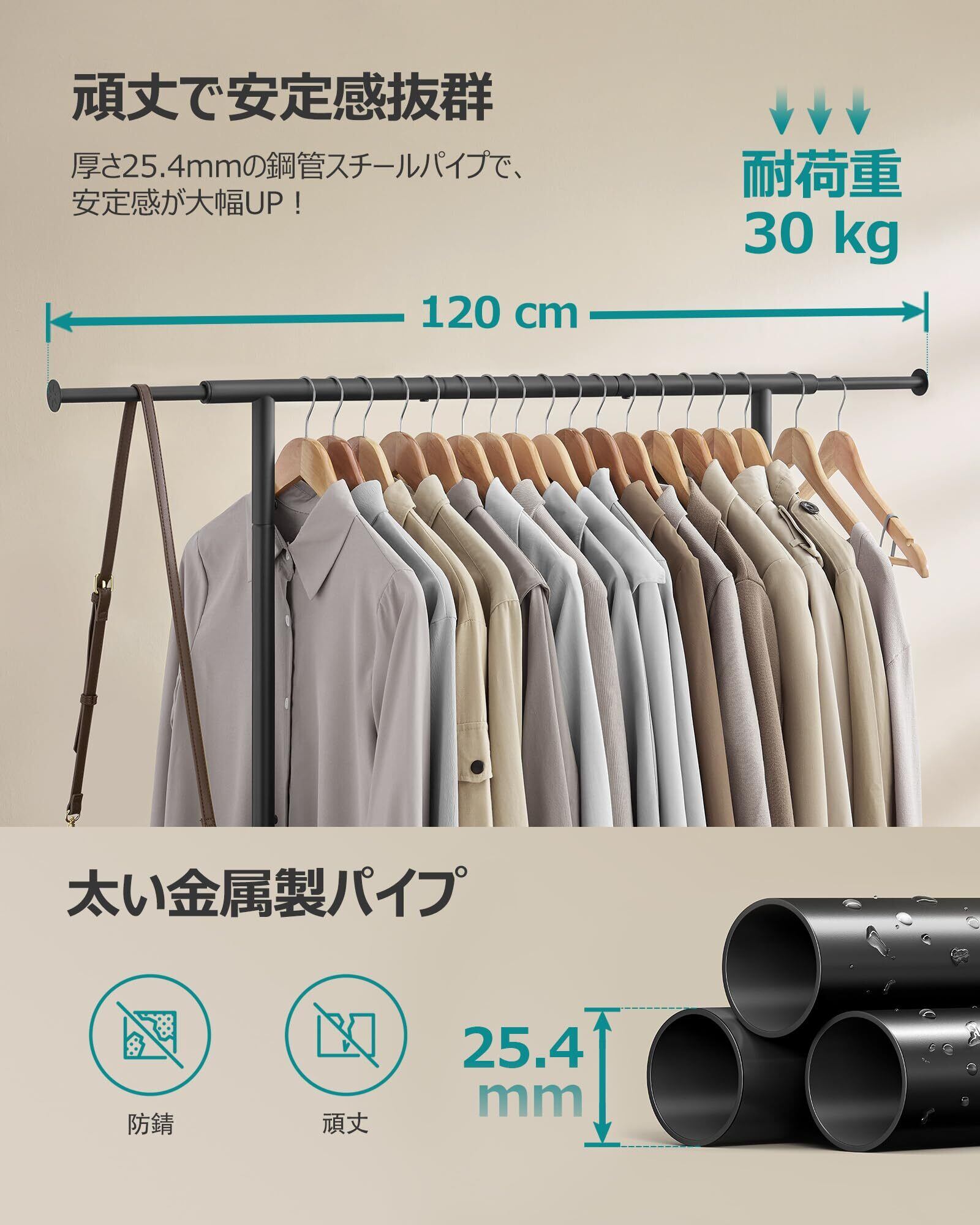 【安定性良い】頑丈なスチール製のハンガーラックなので、強度は強くて、しっかり安定しています。足元はネジで接続されていますが、通常の差し込み式より変形しにくく、長い年月のご使用に耐えられます。総耐荷重は約45kgありますので重めのコート等を掛けても安心です。