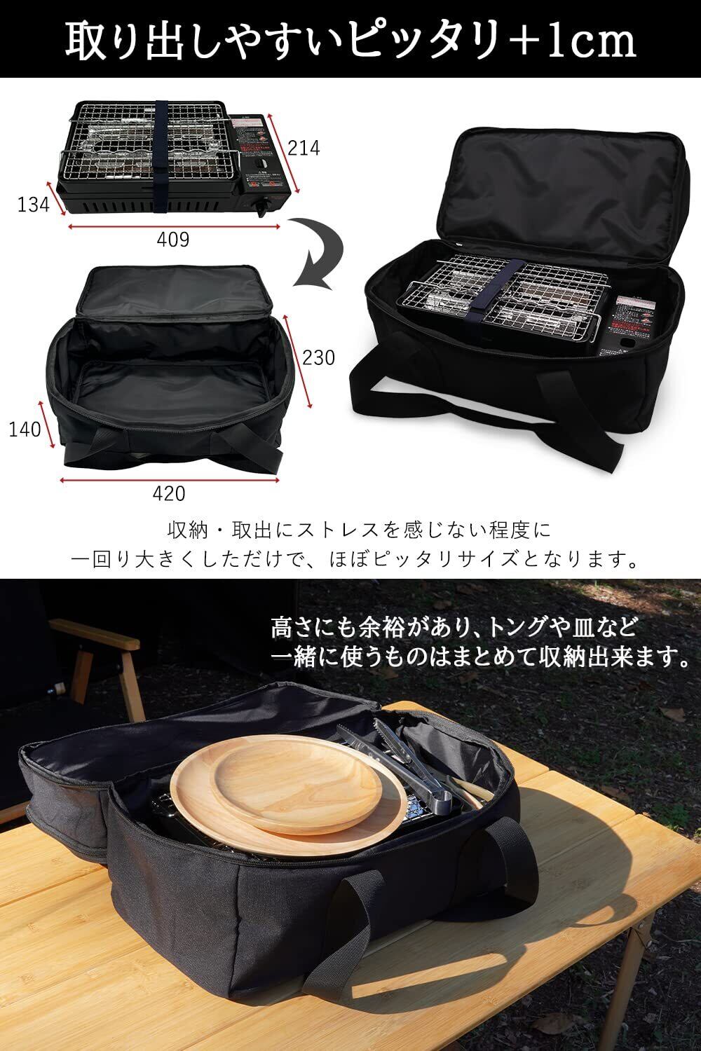炙りや本体を収納するスペースのサイズは長さ42cm×幅23cm×高さ15cmと収納バッグに入れる際、取り出す際にストレスを感じない程度、一回り大きくしただけで、ほぼピッタリサイズ。