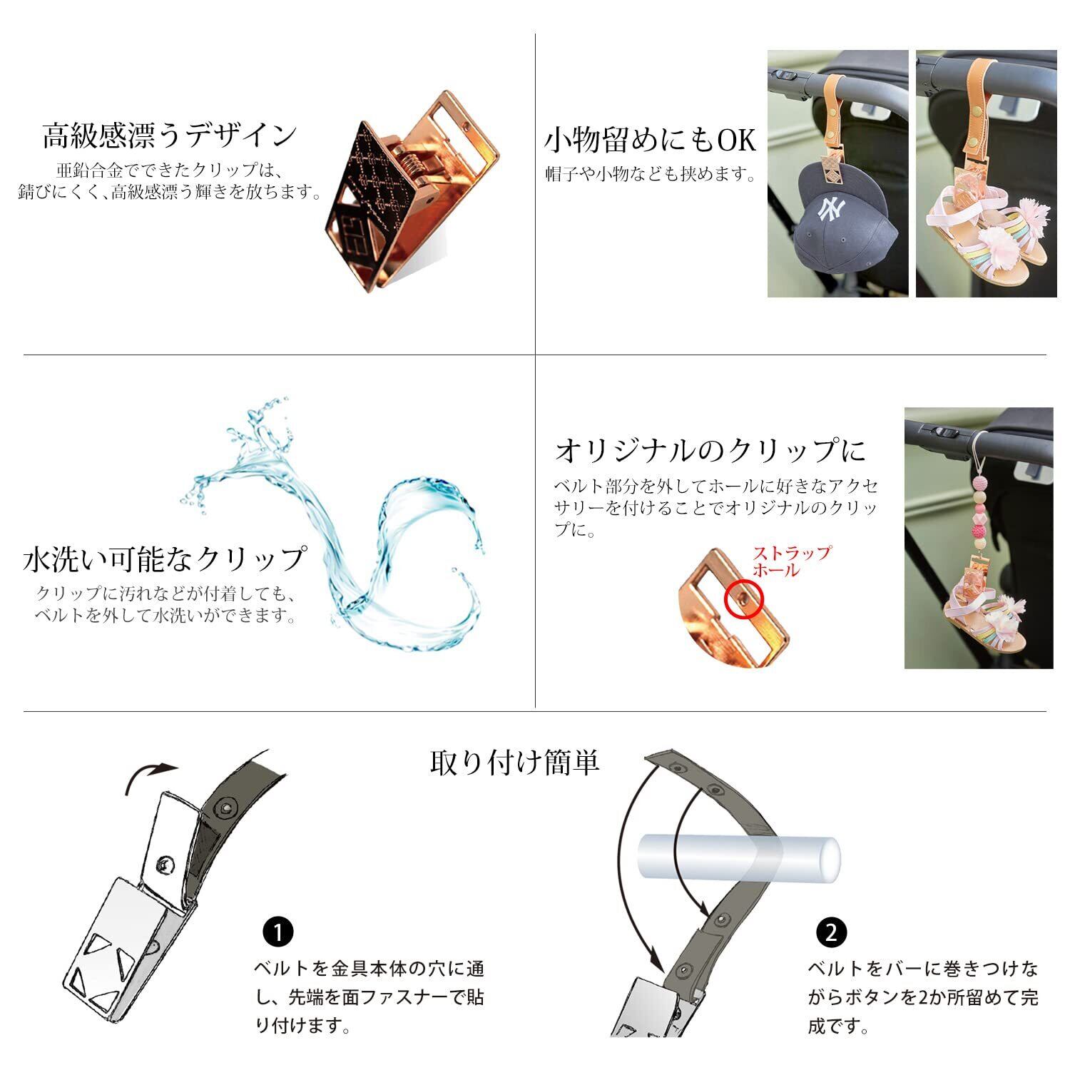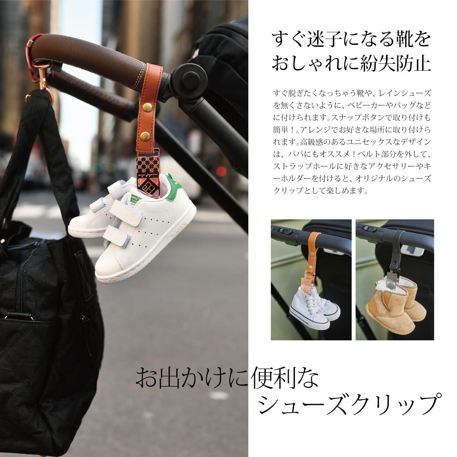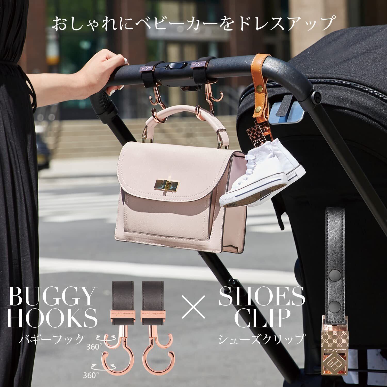ベビーカーをDressUpするバギーフック&シューズクリップのオシャレな2点セット。インスタグラムや雑誌での紹介も多数!著名人にも愛用いただいているアイテムです高級感のあるデザインで出産祝いのギフトにもおすすめ!