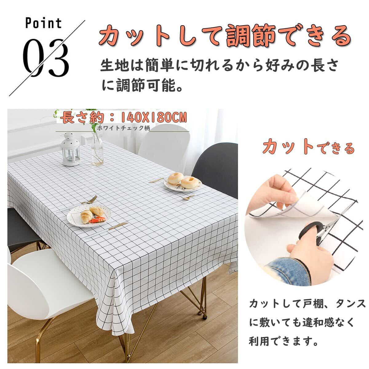 【長さ調節可能】テーブルクロスの長さは180cmで、幅さは140cmですが、生地が簡単に切れるから、好みの長さにカットして調節できます。