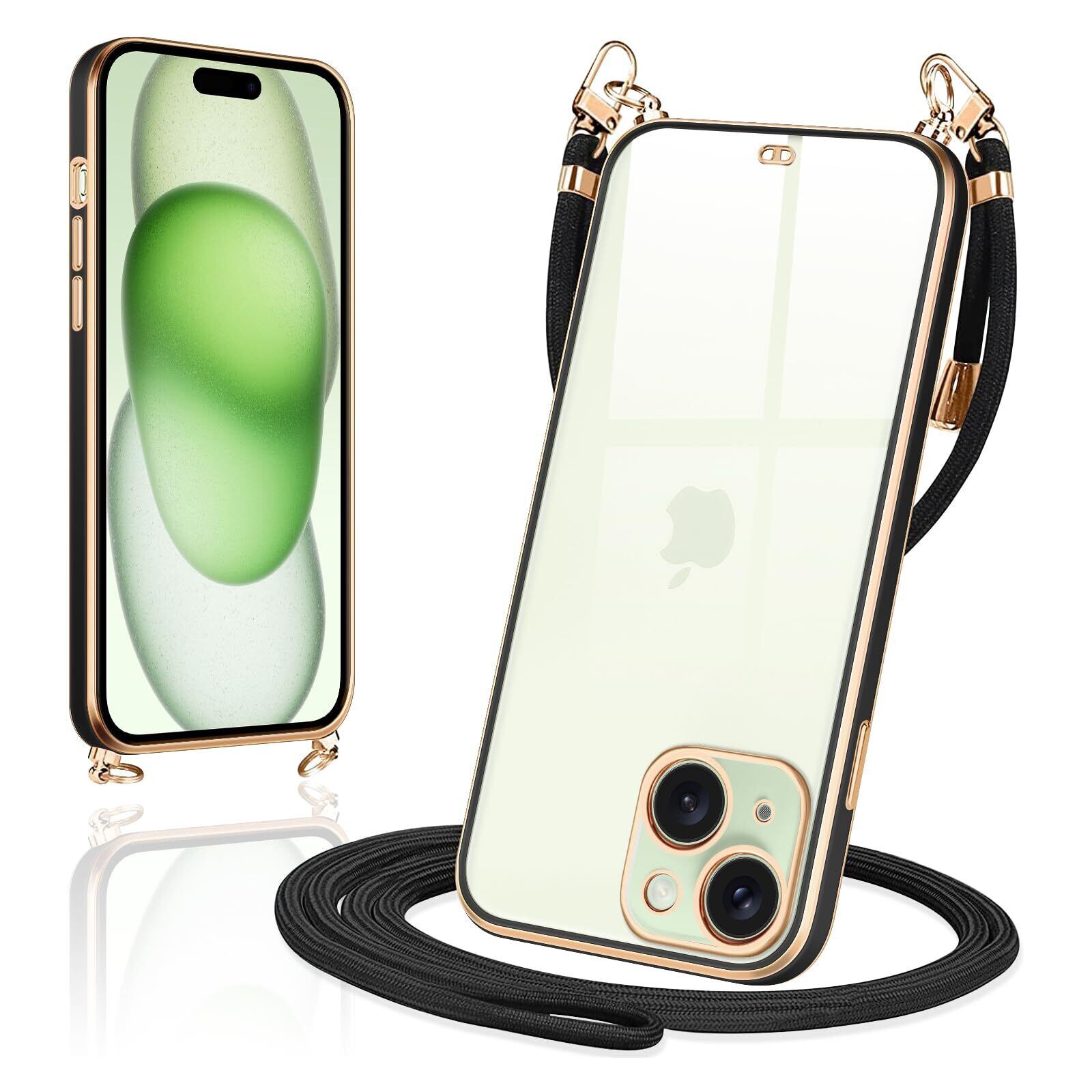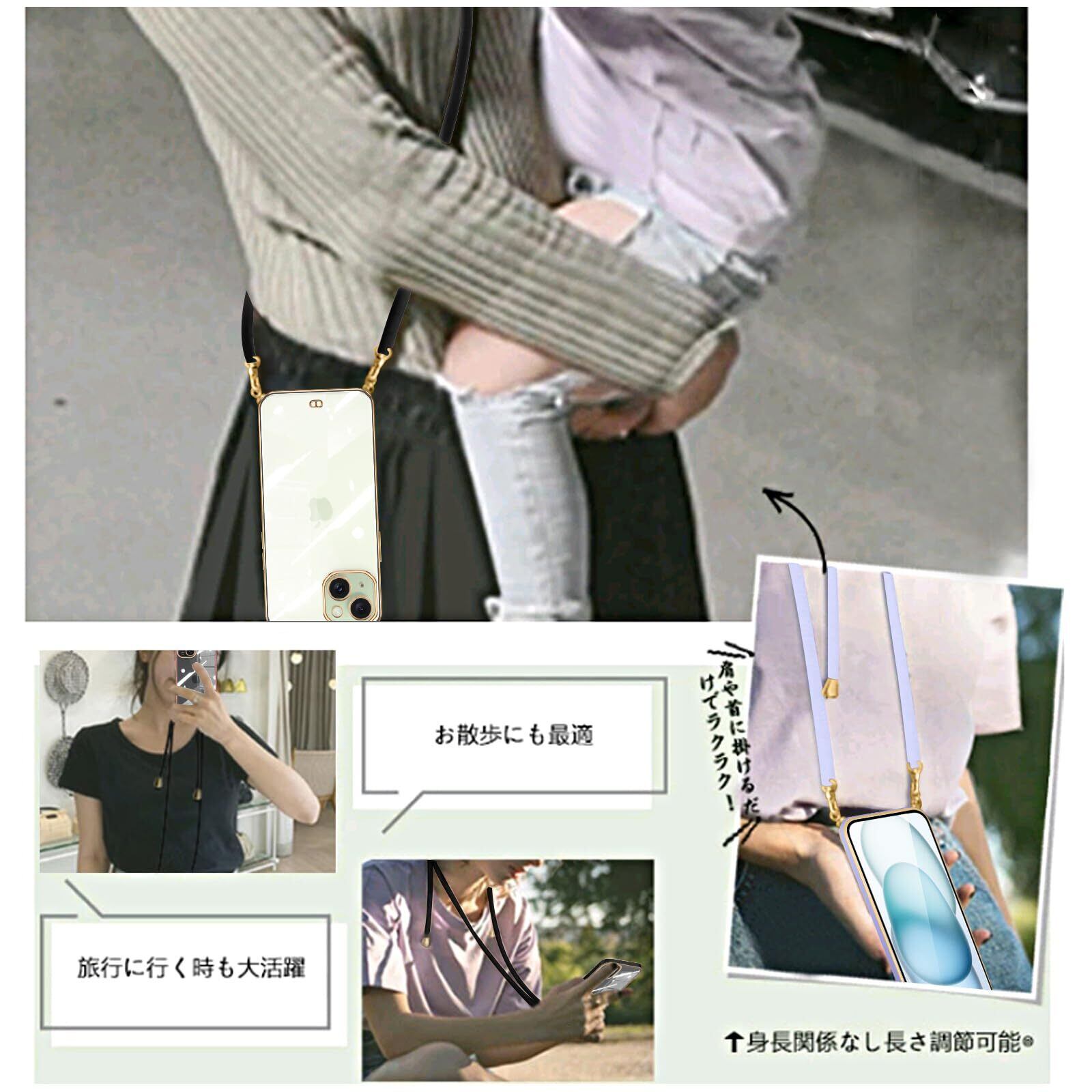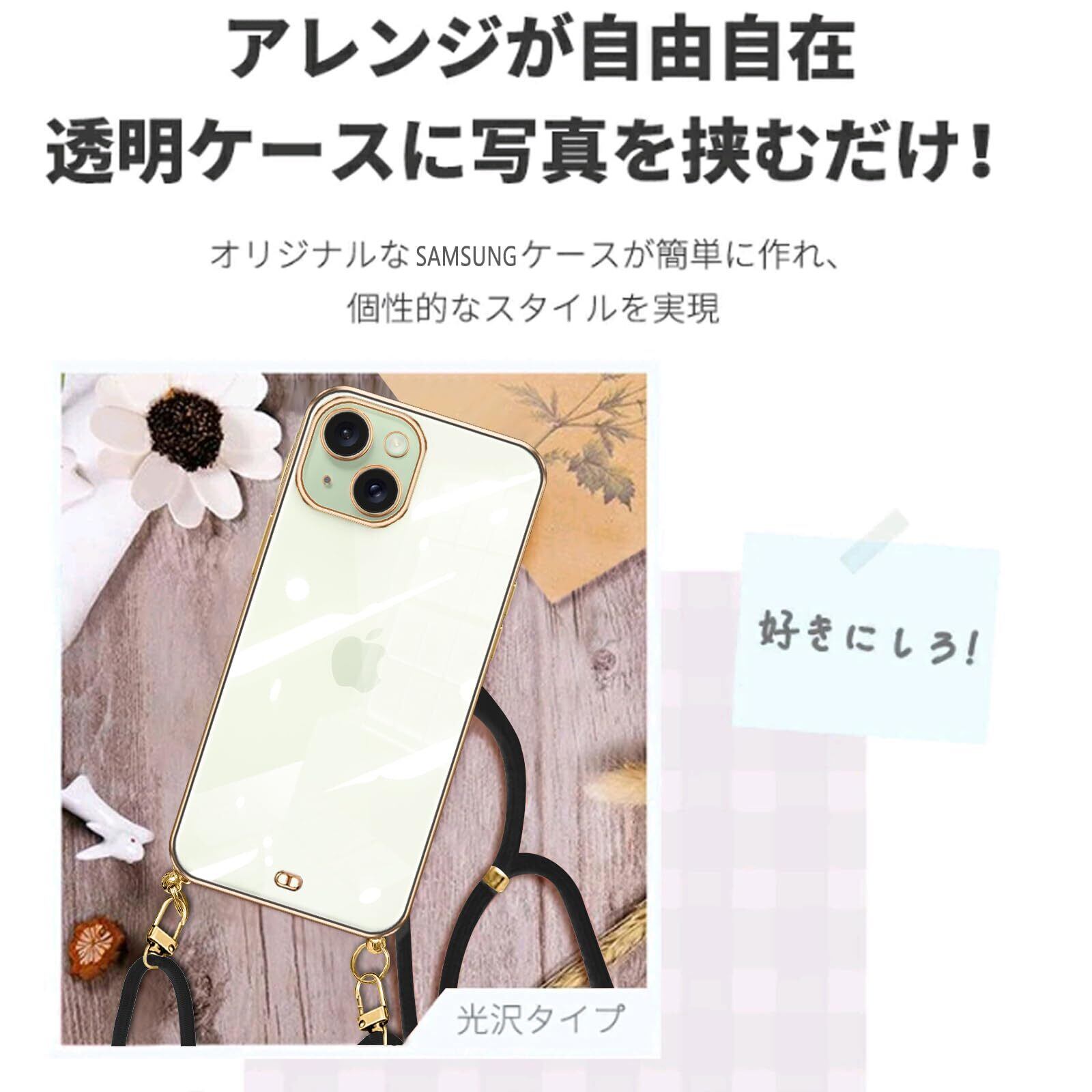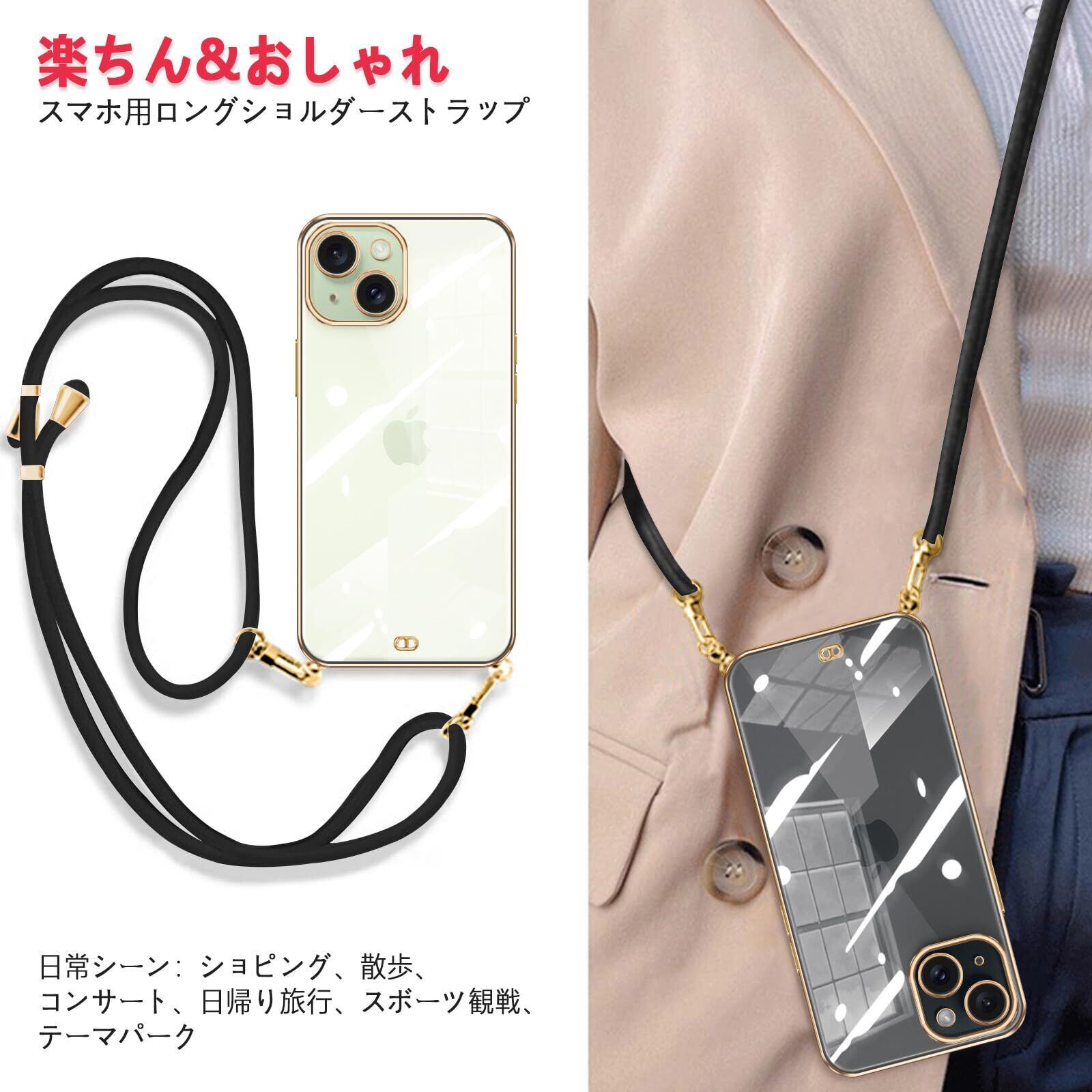 iPhone15 ケース ショルダー クリア いphone15 スマホケース カバー 肩掛け 首掛け 斜めかけケース 可愛い かわいい 韓国 透明 TPU 薄型 耐衝撃 シリコン アイフォン15(ブラック)