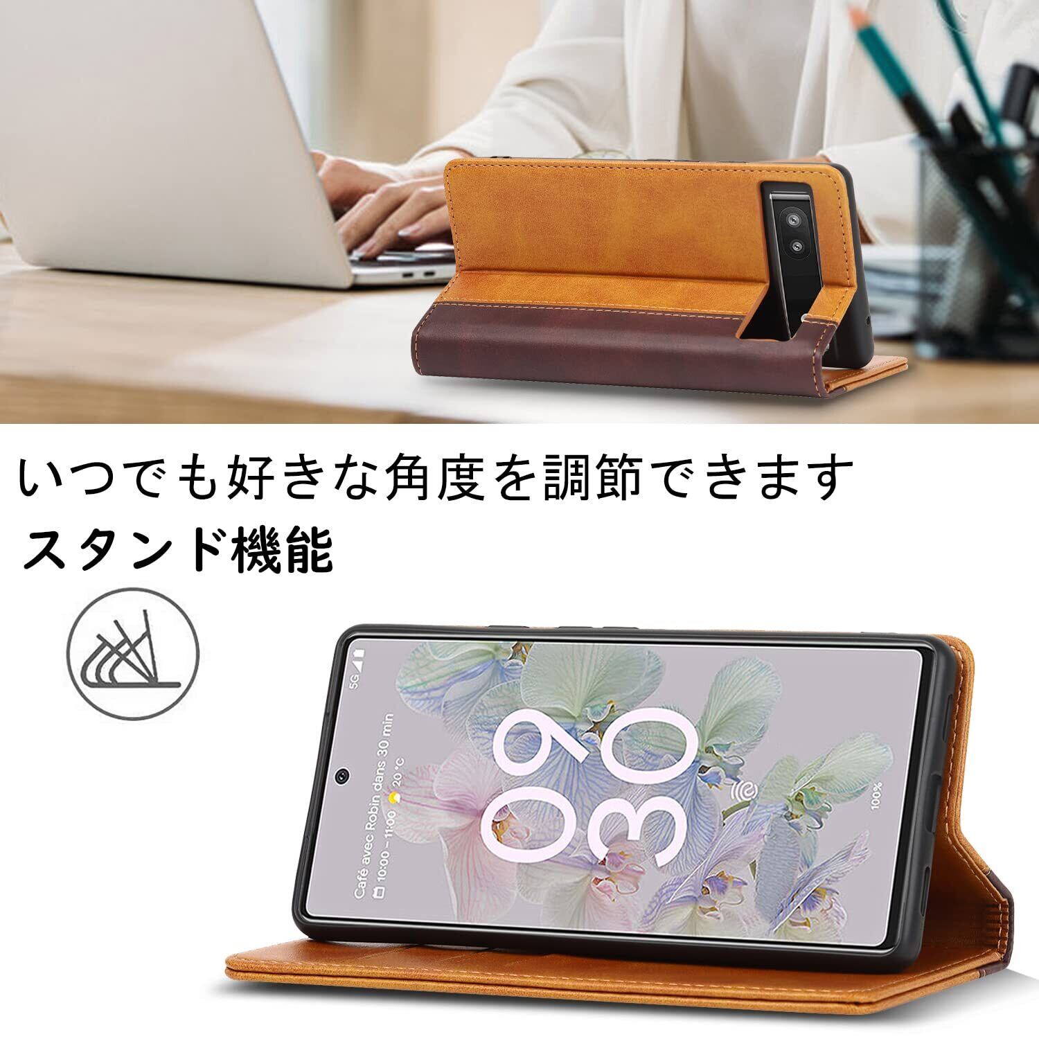 【収納機能】Google Pixel 6aケース内側には三つのカード入れとフリーポケットがつき、カード類や紙幣、名刺などが収納できます。カードスロットに2枚のカードを入れると、内蔵マグネットの機能を最大限に発揮し、カードが消磁されるのを防ぐことができます。横置きスタンド機能が付き、横向いて斜めに立てて、自由に角度を調整して、お好みの角度で動画鑑賞や読書などを楽しめます。長時間での新幹線、飛行機の中での暇つぶしに最適です。