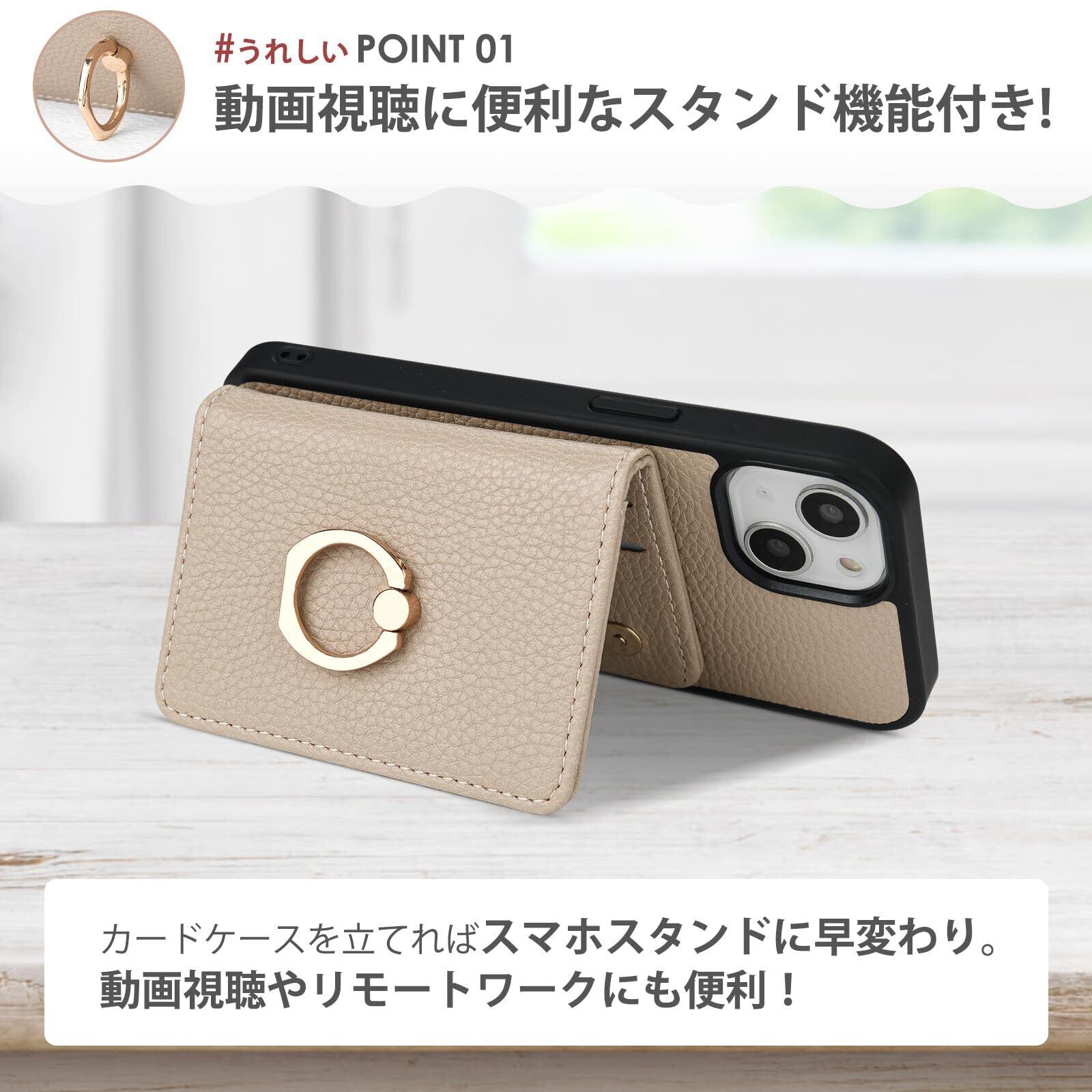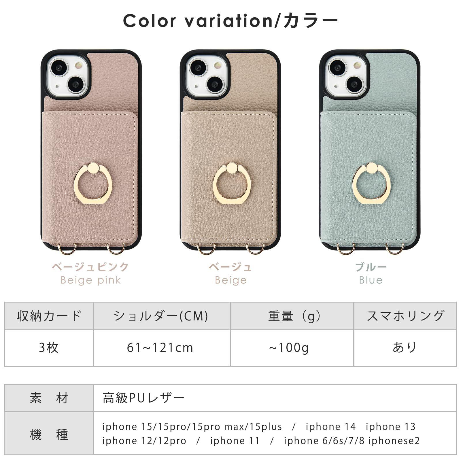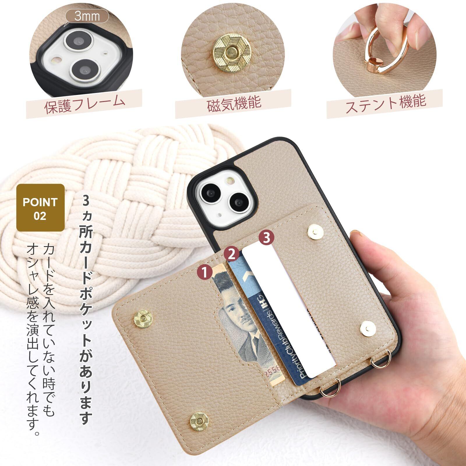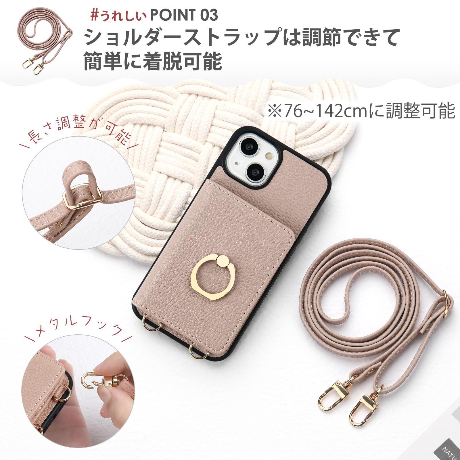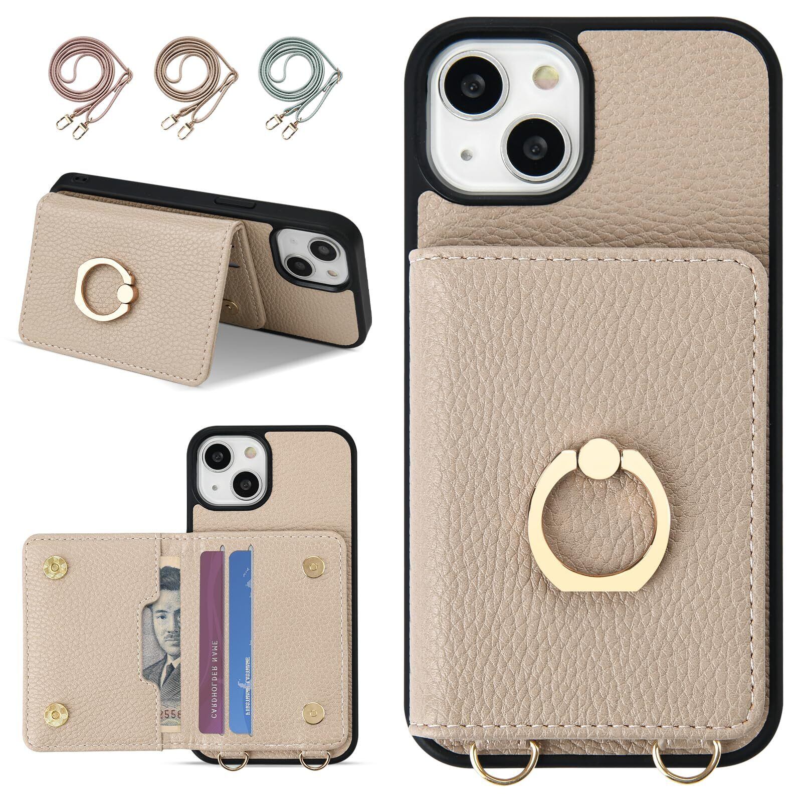 oyaka 対応 iPhone13ケース ショルダー アイフォン 13 スマホケース 背面 財布型 カード収納 可愛い お洒落 リング付きケース あいふぉん 13 ケース 手帳 首掛け 肩掛け スマホ ショルダーケース ストラップ iPhone13 携帯 ケース 磁気 PUレザー 衝撃吸収 全面保護-グレーベージュ