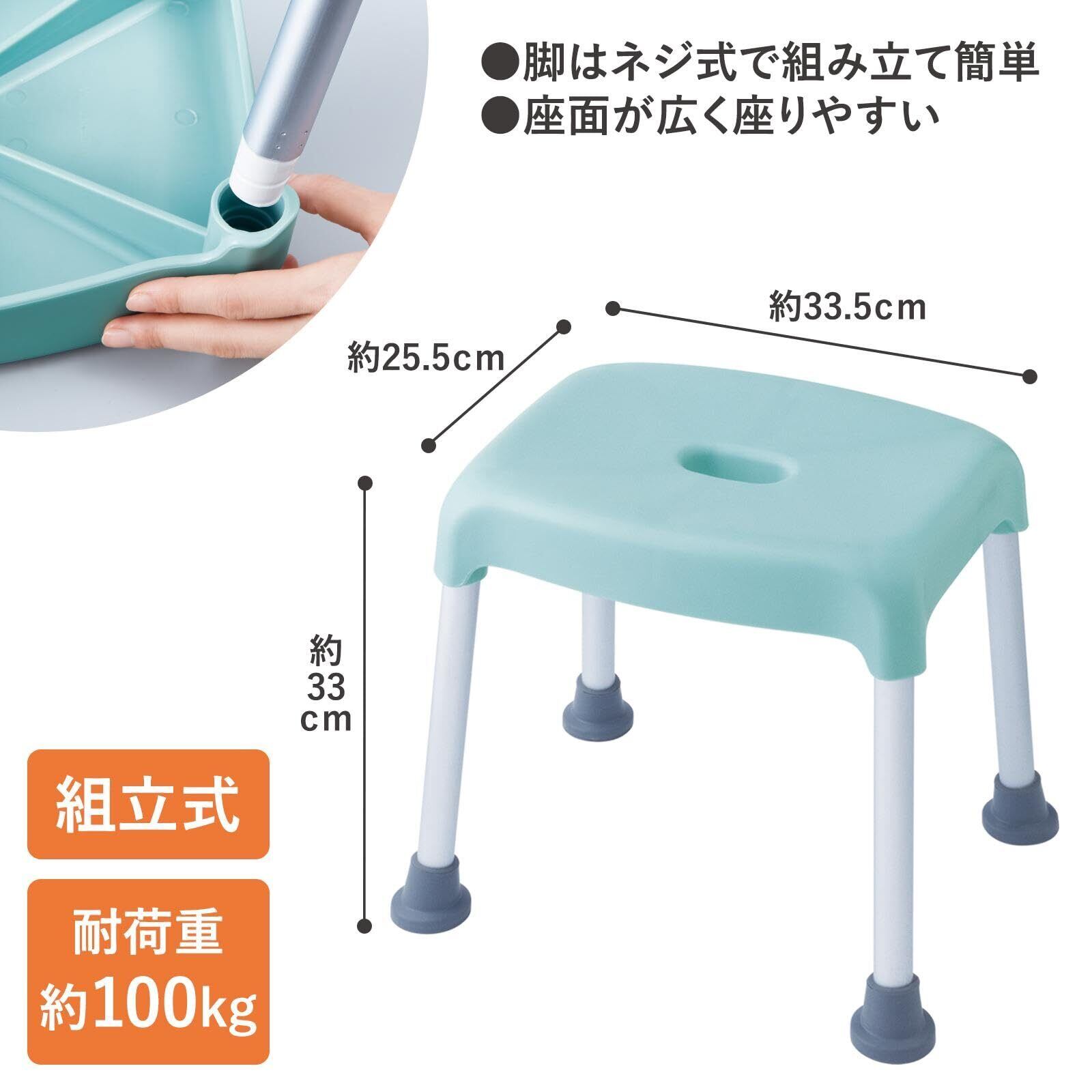 耐荷重は約100kgまでです。組み立てが必要です。浴室での使用時は滑り止めキャップが正しく取り付けられていることを確認してください。