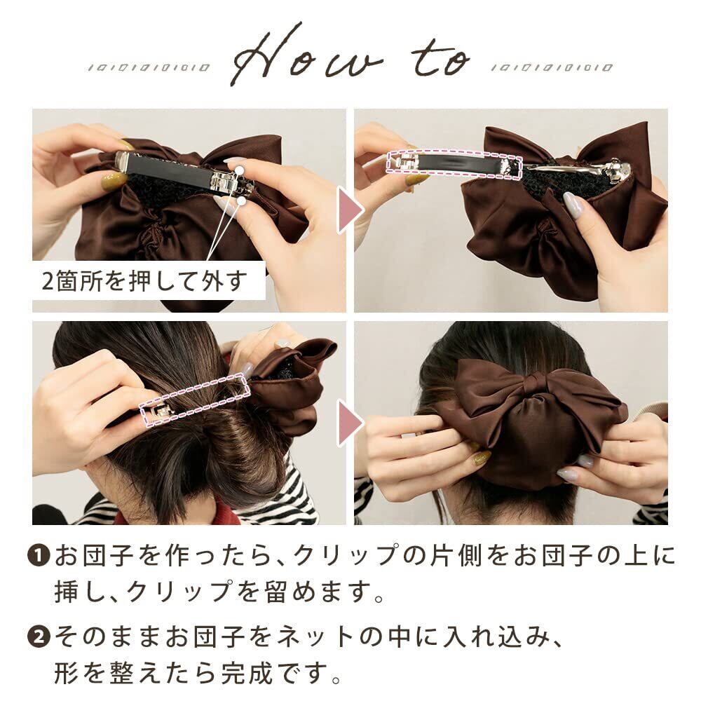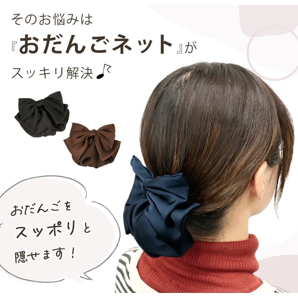 【大きめリボンでおしゃれにカバー】 お団子部分にすっぽりかぶせるだけで、髪のまとまりとデザイン性を両立できる便利なアイテム。大きめリボンのボリューム感で髪の広がりや毛先のはみ出しをしっかり隠しつつ、後ろ姿をぐっと華やかに。黒・紺・茶といった落ち着いたカラー展開で、甘すぎず大人でも使いやすい上品な印象に。制服やスーツとの相性も良く、学校・職場・フォーマルな場にも自然になじみます。インナーカラーや白髪をさりげなく隠したい時にも重宝する、見た目と実用性を兼ね備えたリボンネットです