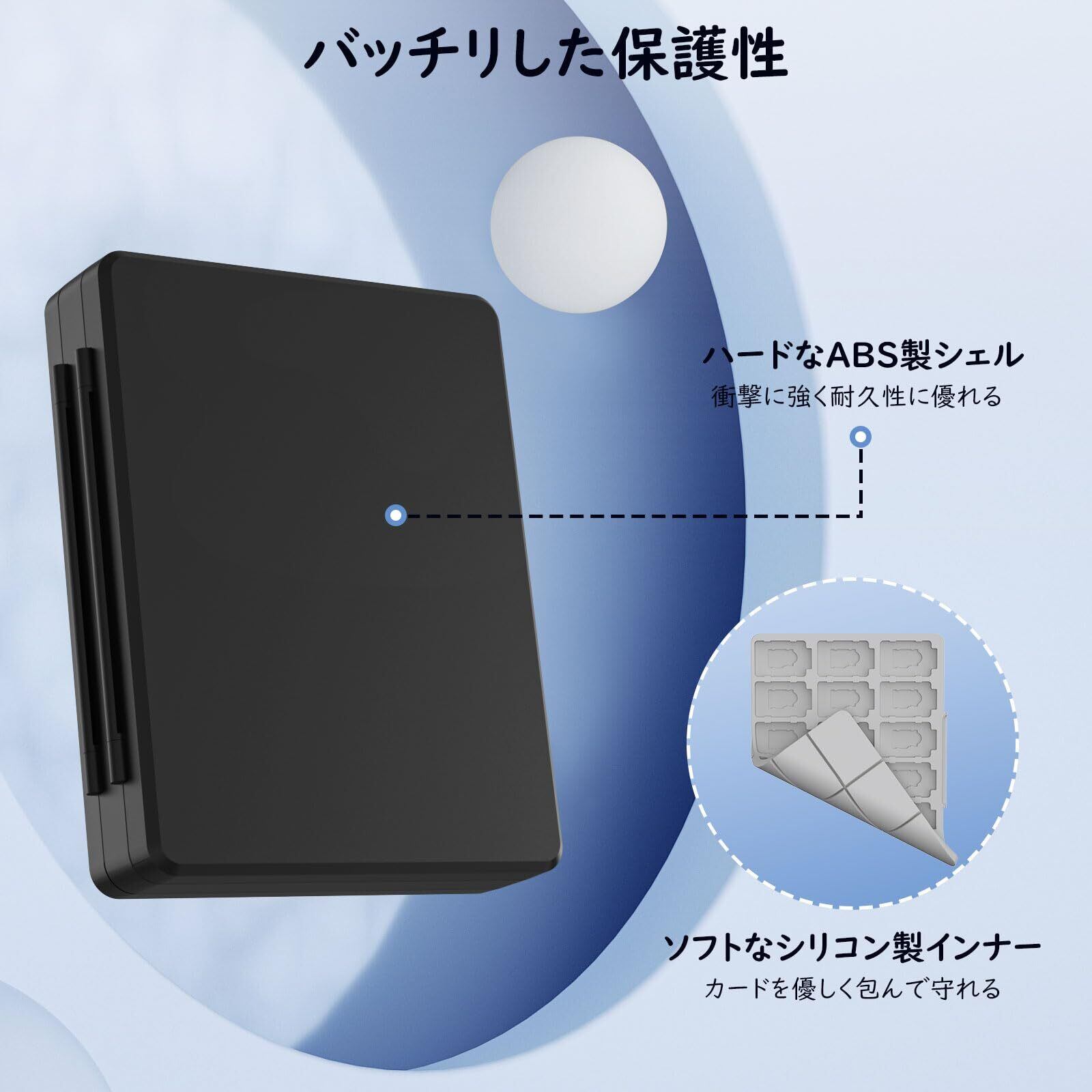 「大容量カード収納」 収納スペースを最大化した合理的に設計し、カードの形に仕切りした収納スロットで、各カードをピッタリ装着して固定収納できます。最大60枚Switchソフトを収納できる他、DSソフト24枚/Micro SDカード36枚同時に収納保管できます。