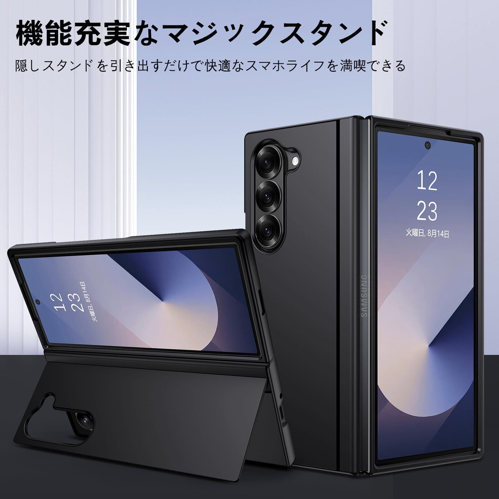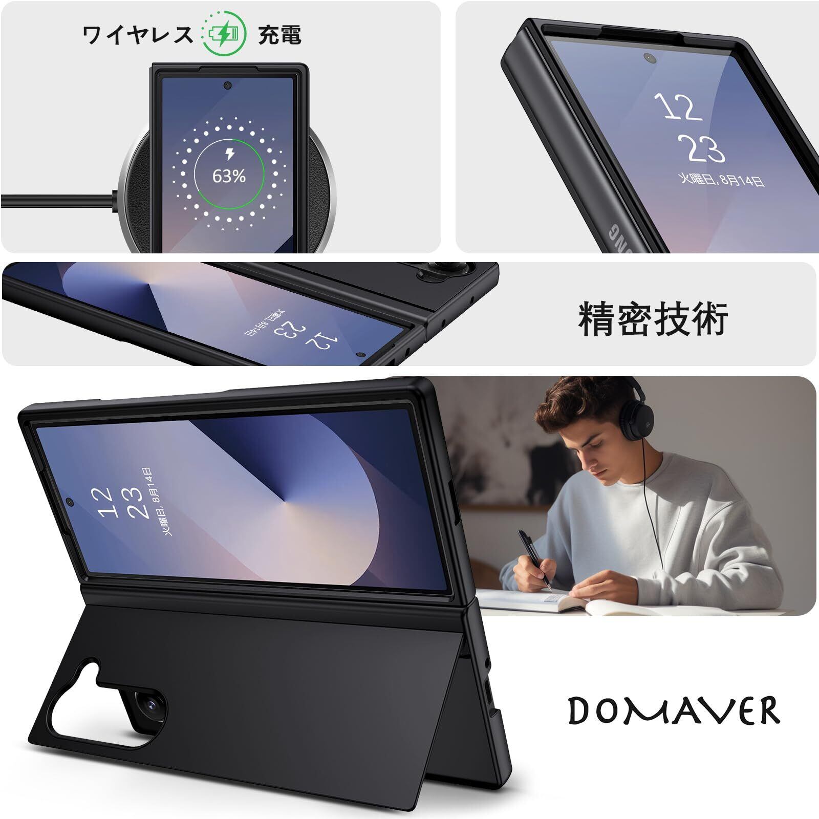 DOMAVER Samsung Galaxy Z Fold6 5G 用 ケース スタンド機能 折り畳み 超薄 超軽量 耐衝撃 指紋防止 PCケース ワイヤレス対応 傷に強い背面 滑り止め 黄ばみなし ストラップホール付き 画面レンズ保護 7.6インチ ギャラクシーゼットフォールド6ケース 用カバー ブラック