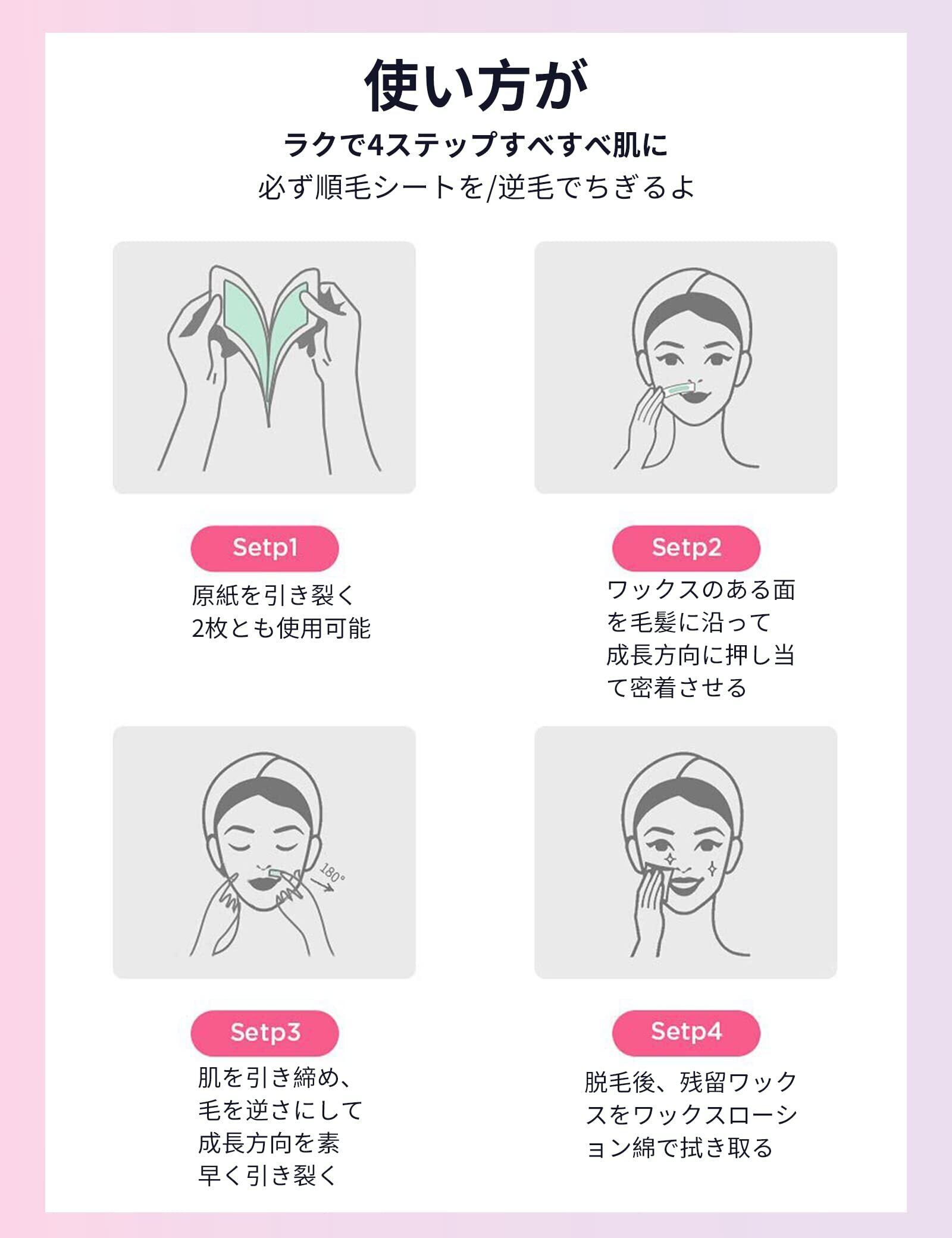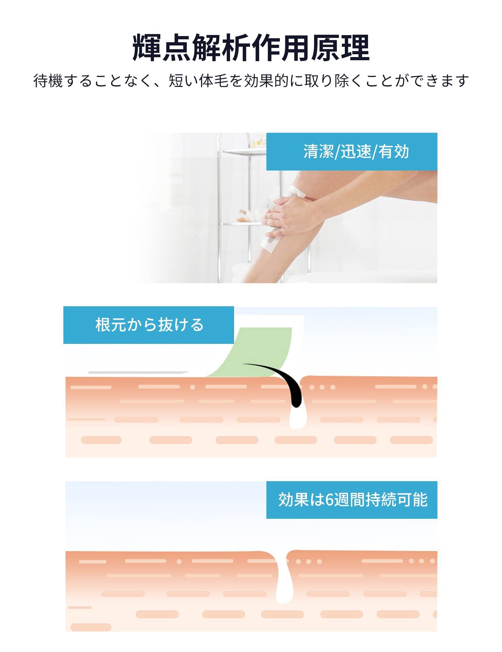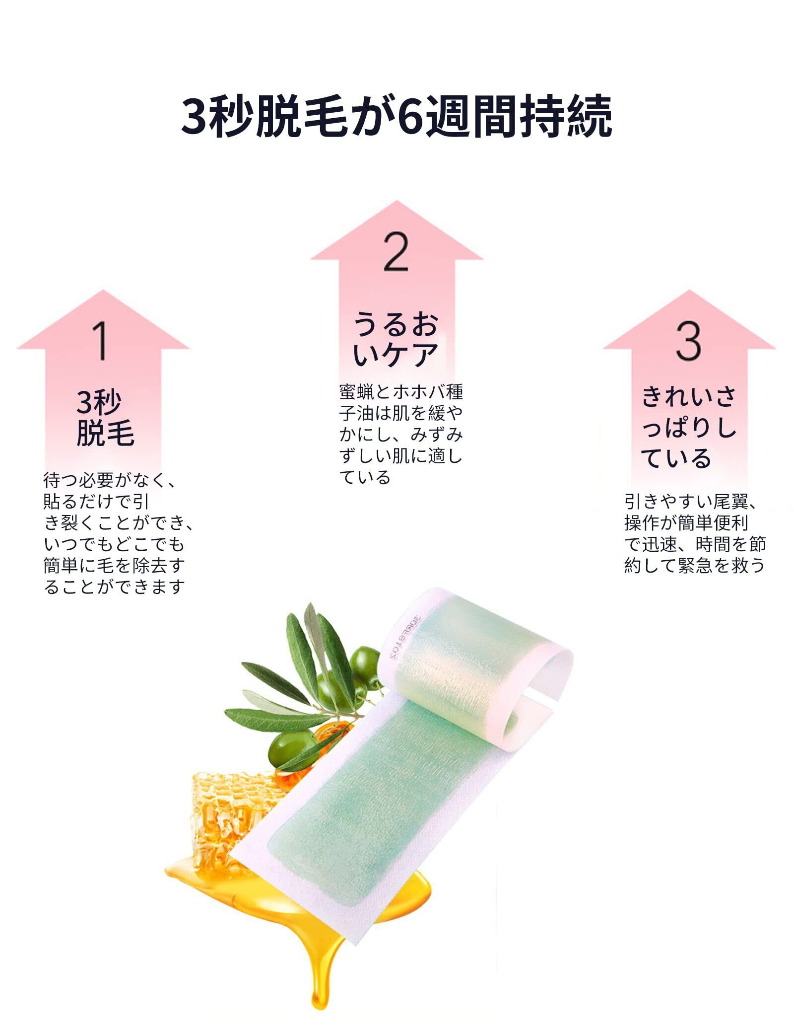 【使いやすさ】: 使用前に両手で5~10秒温め、ワックスペーパーをはがし、貼り付けた後、毛の流れに逆らって素早く引きはがすと、脱毛が完了します。 除毛後、付属の保湿スキンケアシートで肌に残ったワックスをふき取り、肌をなめらかにしっとりと整えます。