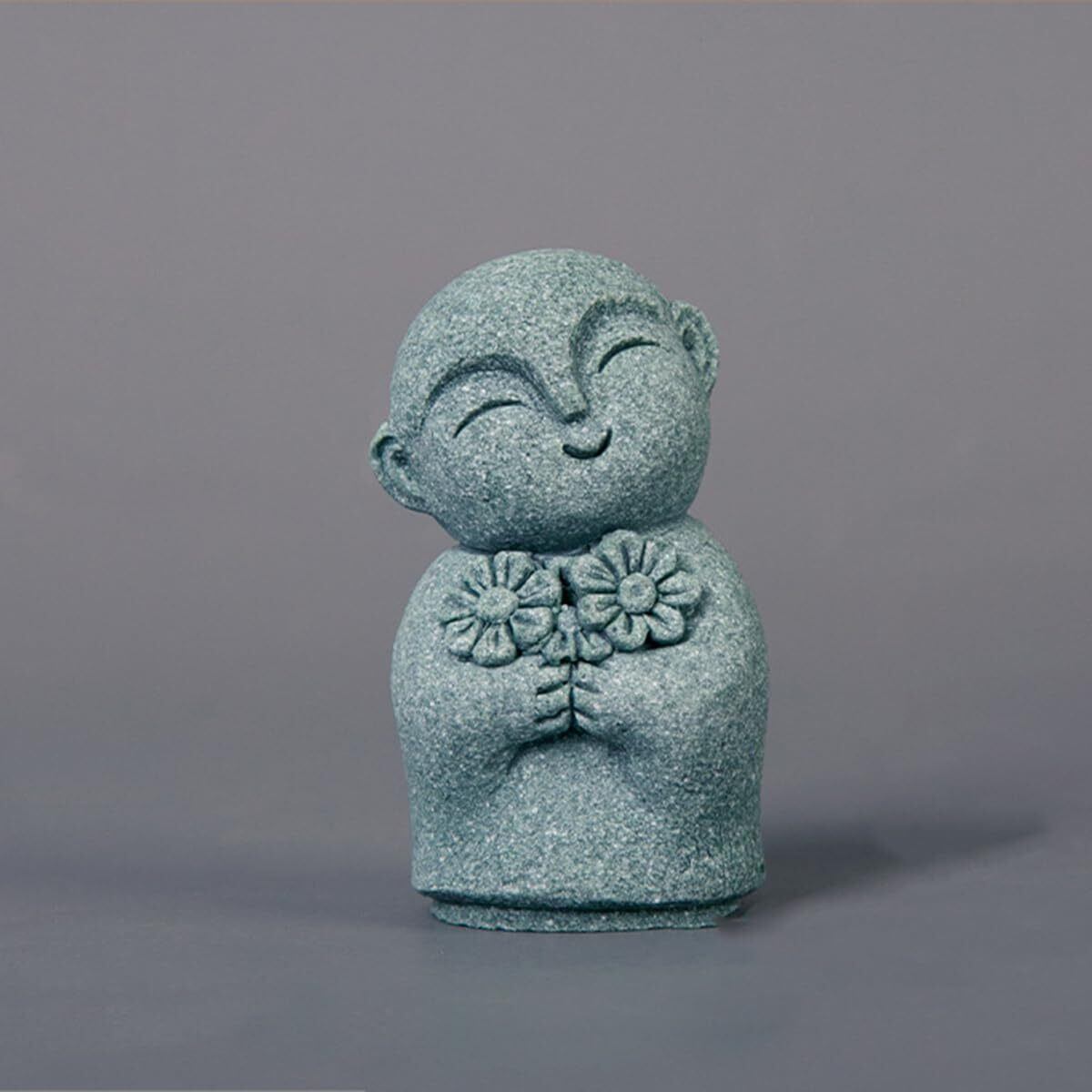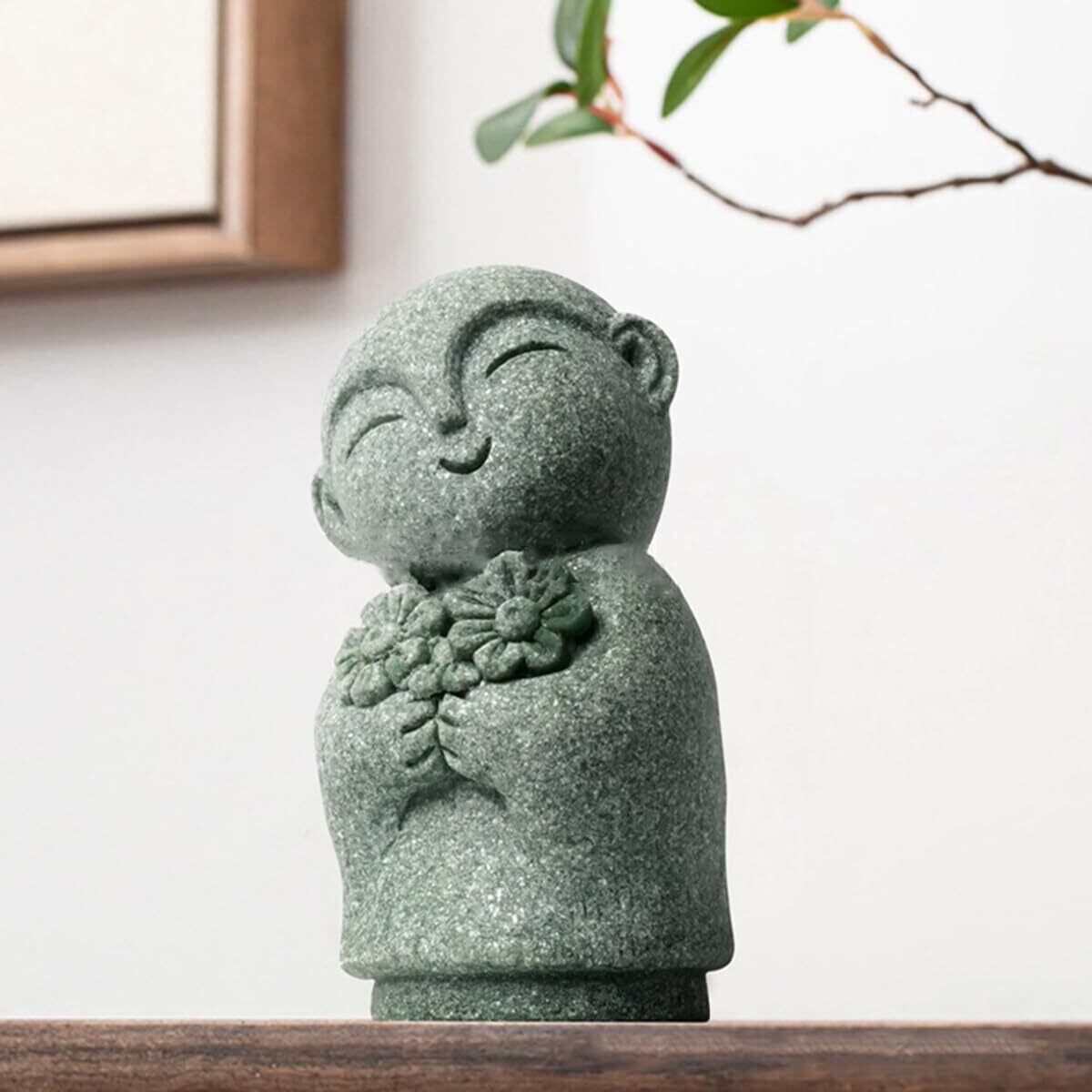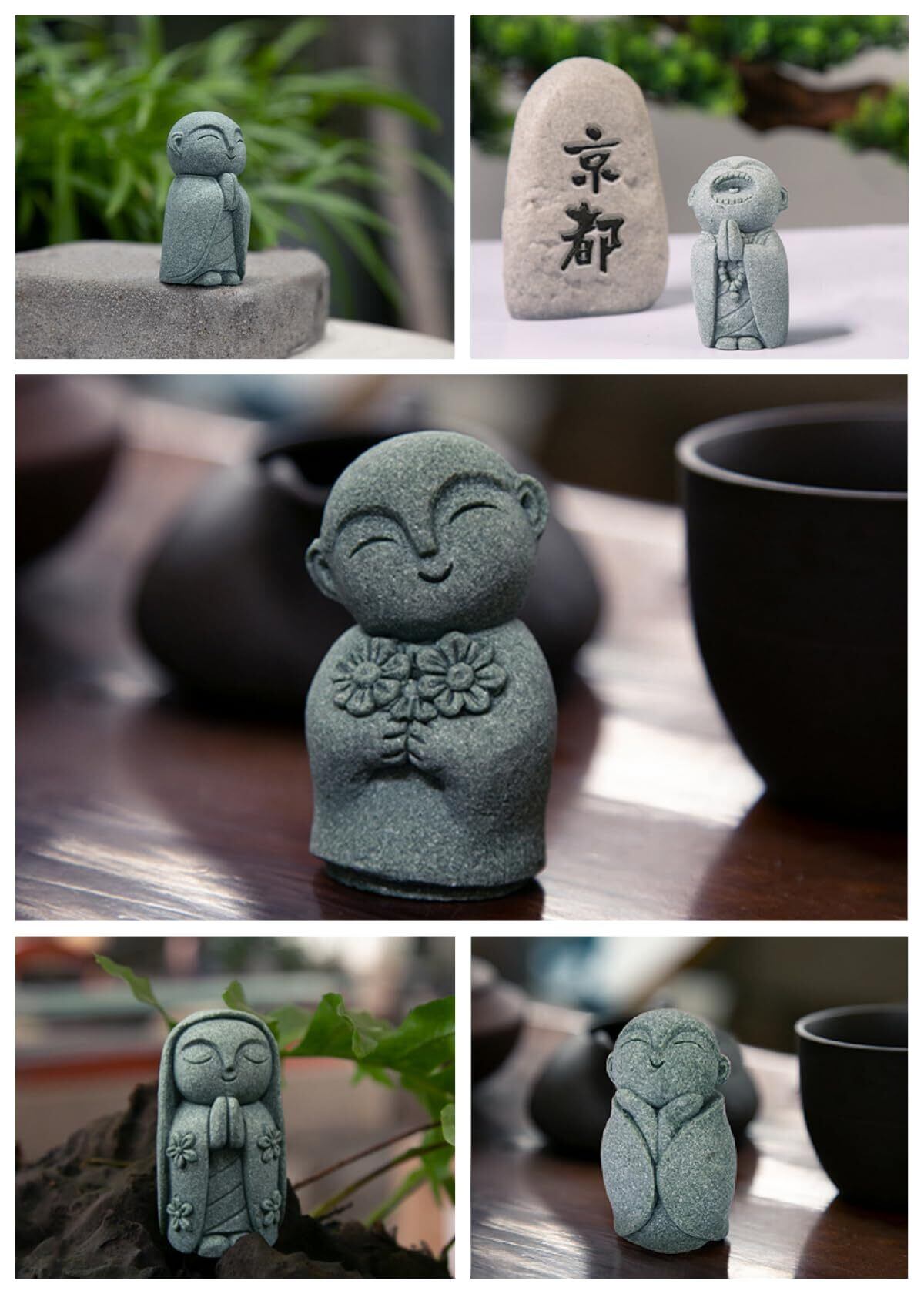【店主からのメッセージ】:店主は京都の寺院を訪れた際、可愛らしい小さな僧侶や地蔵菩薩の石像を発見し、面白く美しい意味を感じました。帰宅後、名工の彫刻模型を探し、砂岩合成技術を使用して美しい小さな飾りを制作しました,白御影石で作られた手のひらにのせられる小柄なお地蔵さんです。