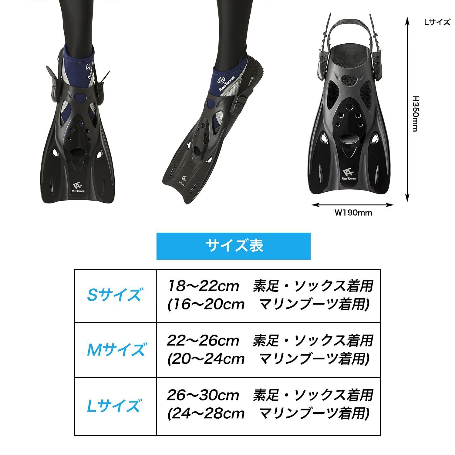 【Amazon.co.jp 限定】 リーフツアラー(REEF TOURER) マリンシューズのままでも履ける サイズ調整ストラップ付 軽量コンパクト シュノーケリング フィン 【ブラック/ブルー/ホワイト】 【S/M/Lサイズ】 RF0106P