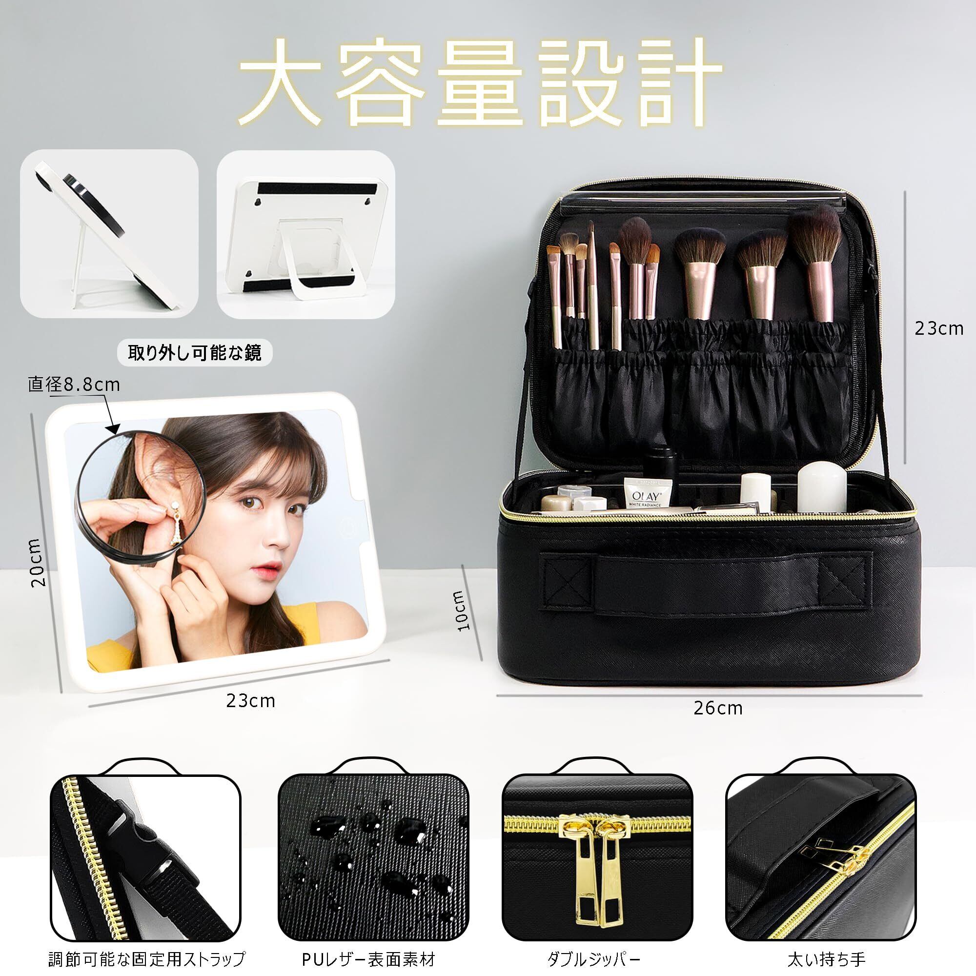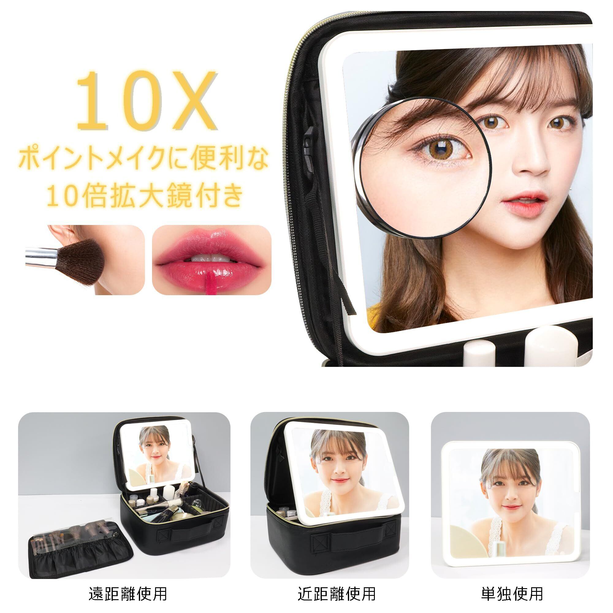 AMZTOLIFE メイクボックス 鏡付き LEDライト付き コスメボックス 3色照明 無段階調光 10倍拡大鏡 USB充電式 大容量 コスメ収納 メイクブラシ入れ 持ち運び 旅行 出張用 メイクポーチ (ブラック)