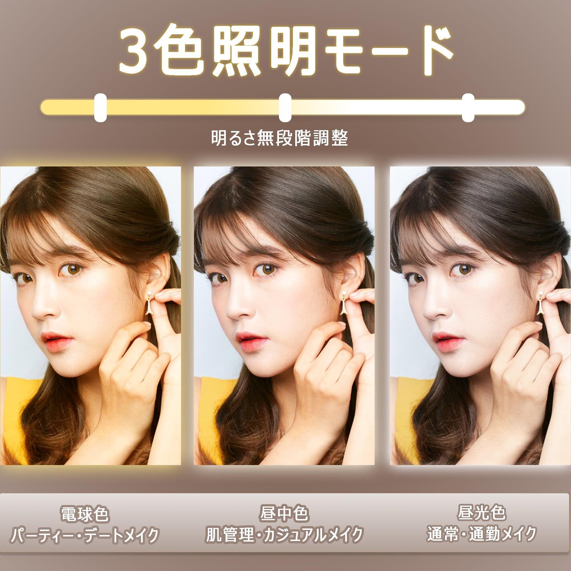 【LEDミラー付き】ボタンをワンタッチで電球色・昼中色・昼光色の3色に切り替えられます。ボタンを長押しで明るさを無段階に調節できます。USB充電式なので、携帯に便利です。フル充電の場合、最大約3-4時間連続使用が可能です。