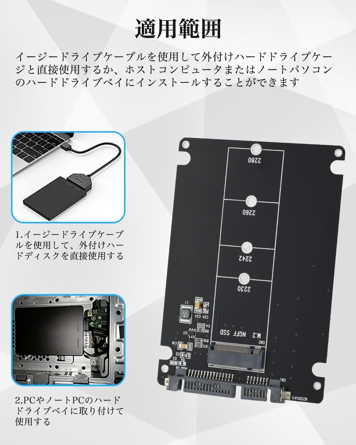 【NGFF to SATA アダプタ】NGFF SSDを2.5インチのハードディスクに変換し、2230/2242/2260/2280mmサイズのM.2 ハードディスクを対応しています。B key、とB+M keyに対応しています。※ご注意:NGFFのみ対応します。NVMEは対応しません※