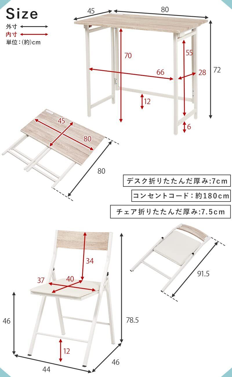 【商品サイズ(約)】デスク:幅80×奥行45×高さ72cm(折りたたんだ状態の高さ:7cm)/チェア:幅44×奥行46×高さ78.5cm(折りたたんだ状態の高さ:7.5cm)