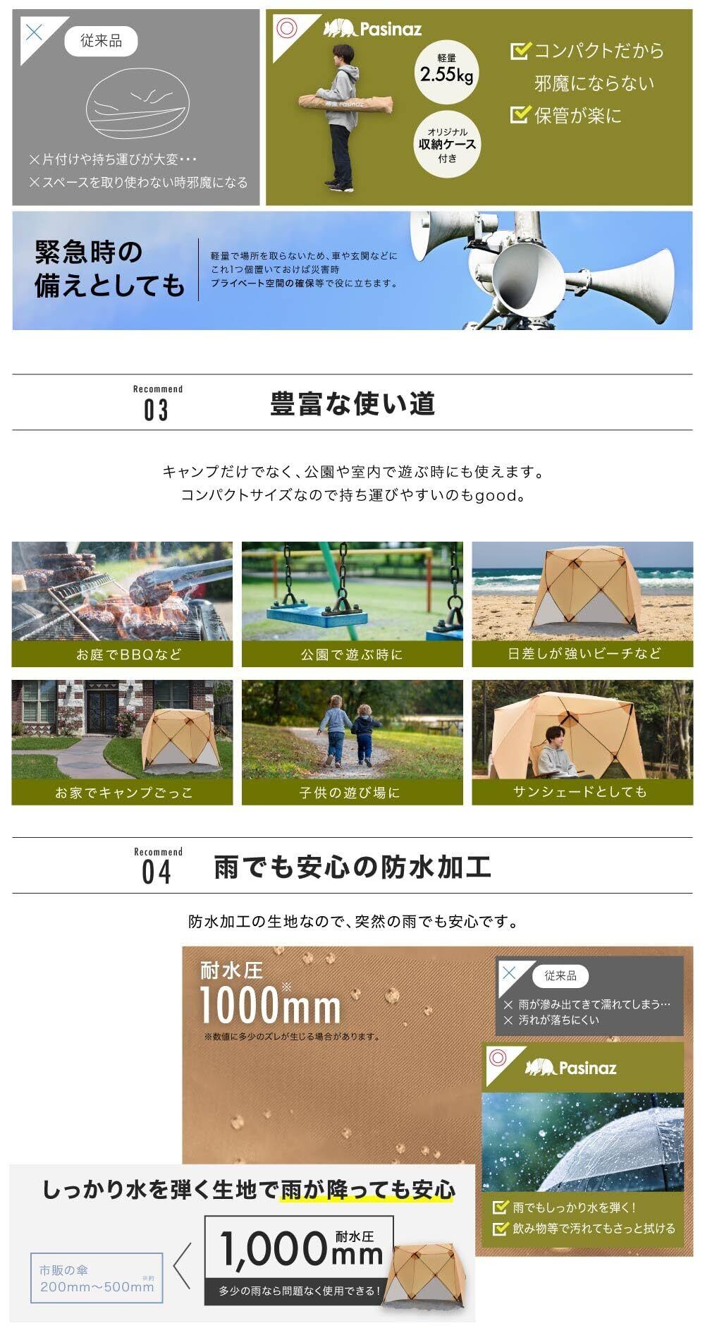 Pasinaz【2024年 テント ついに日本上陸 ワンタッチテント ポップアップテント 海水浴 タープテント キャンプ ポップアップ サンシェード UVカット ピクニック 4人用 おうちキャンプ 遮光 遮熱 海 川 庭 公園 ベランピング ベランダ アウトドア 室内 大人 子供