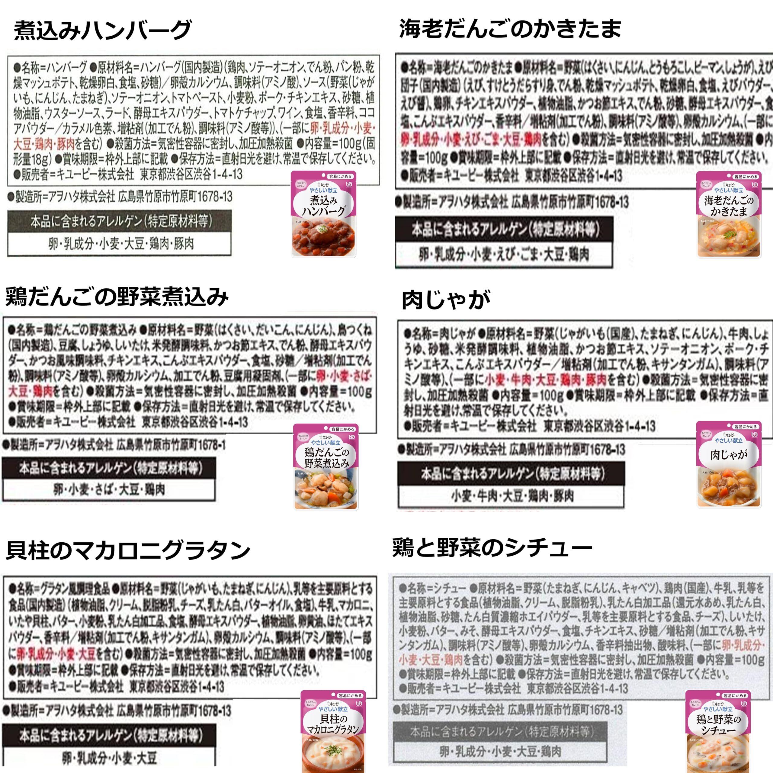 野菜(たまねぎ、にんじん、キャベツ)、鶏肉(国産)、牛乳、乳等を主要原料とする食品(植物油脂、クリーム、脱脂粉乳)、乳たん白加工品(還元水あめ、乳たん白、植物油脂、砂糖、たん白質濃縮ホエイパウダー、乳等を主要原料とする食品、チーズ)、しいたけ、小麦粉、バター、みそ、酵母エキスパウダー、食塩、チキンエキス、砂糖/増粘剤(加工でん粉、キサンタンガム)、調味料(アミノ酸等)、卵殻カルシウム、香辛料抽出物、酸味料、(一部に卵・乳成分・小麦・大豆・鶏肉を含む)