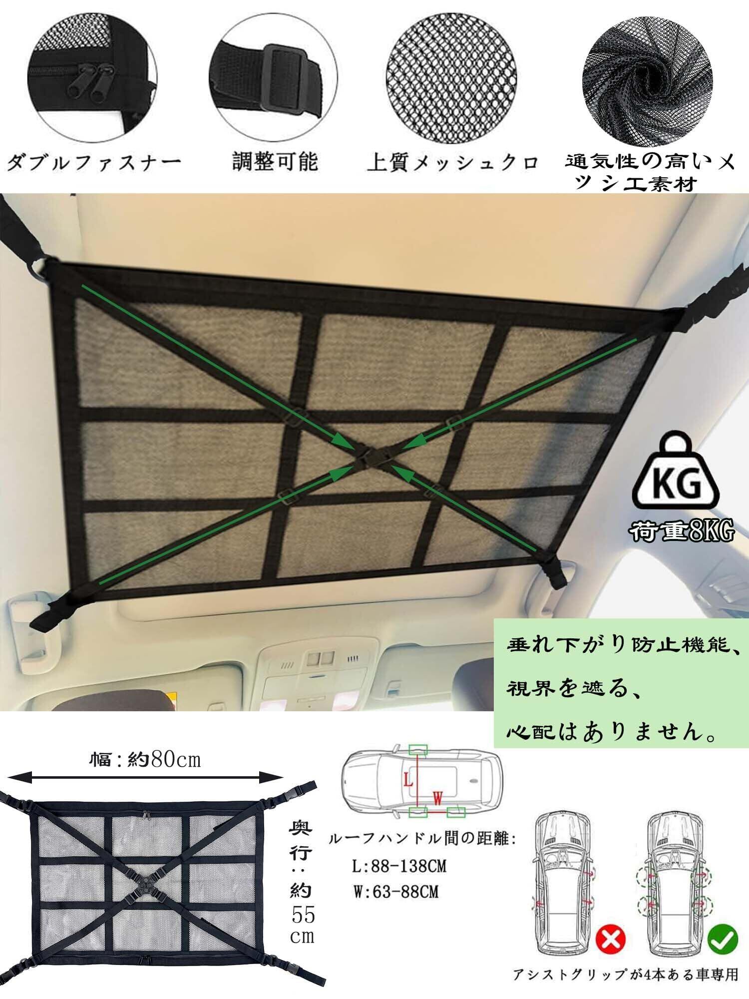 【※必ずご購入前にご確認ください】 お客様のお車の天井にネットを固定できるアシストグリップ等が4箇所あること。もしくはネットが取付可能なサイドバー等があること。 商品画像(5枚目)にある、「ご購入前に取り付け条件をよくご確認ください」を参考にされ、取付寸法がお客様の車とマッチしているか必ずご確認ください。 天井の幅は、ボディの幅よりかなり狭くなっている車両もございますのでご注意ください。