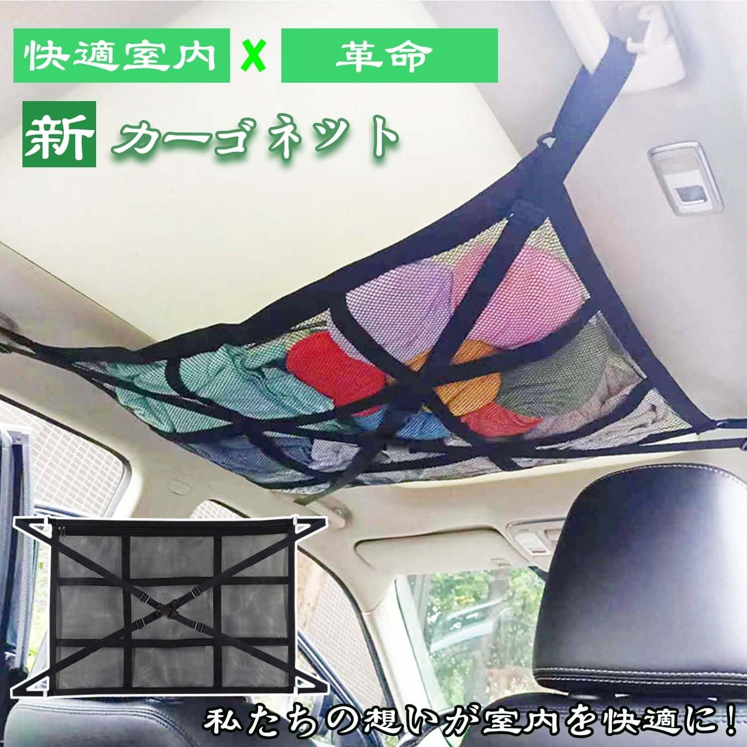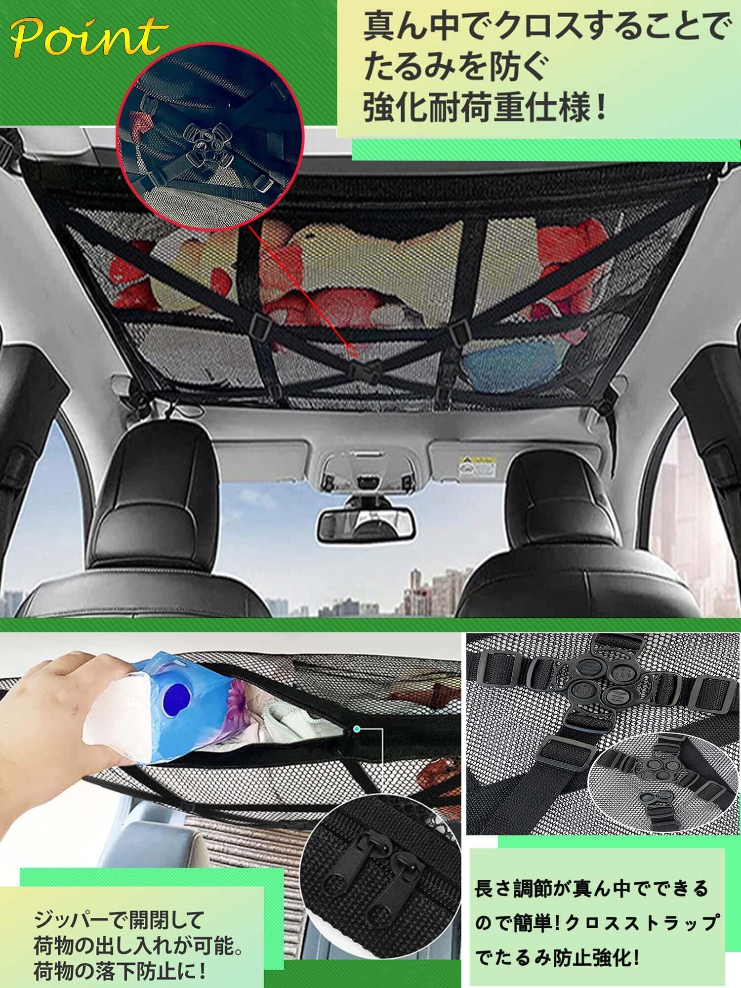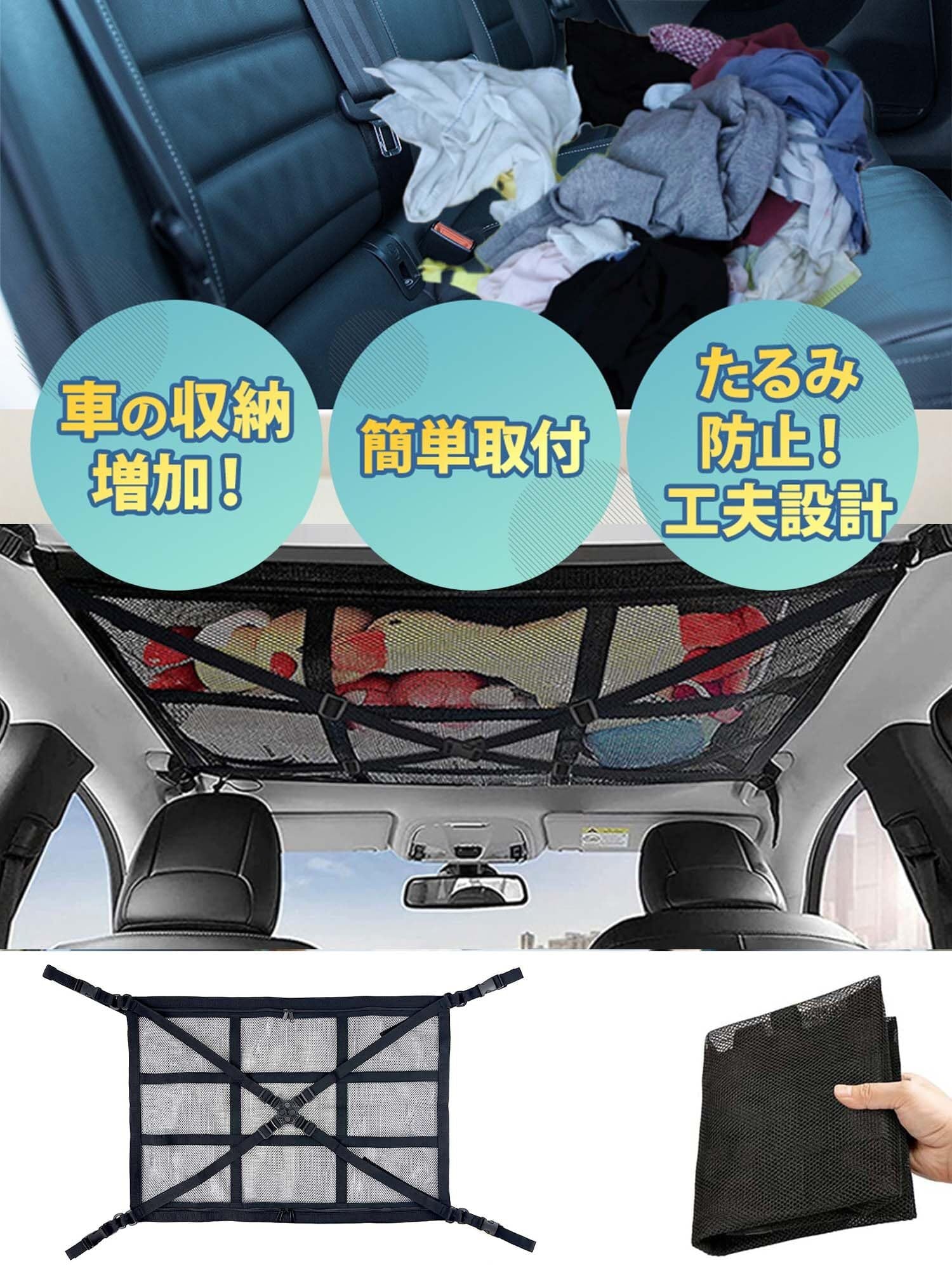 【様々なシーンで大活躍!】①.レジャー、キャンプ、車中泊等の収納に大活躍。 ②.毛布やブランケット、ひざ掛けなどの防寒用品収納。 ③.着替えやタオル等のスポーツ用品の収納。 ④.オムツやタオル等ベビー用品の収納。※軽い物を主体とした収納です。重量物、ネットが破れる可能性のある物、万一落下した際に乗員がケガをする恐れのあるものは乗せないよう注意してください。ネットは折り畳んで収納できるので場所をとらず車内に格納できます。