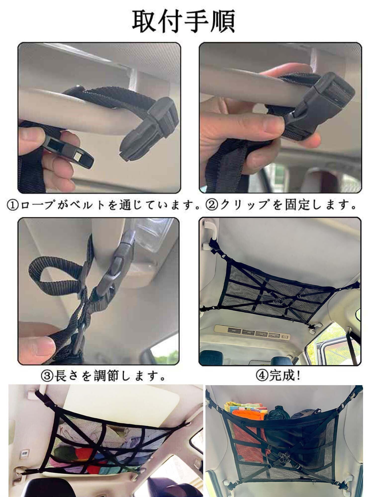 【簡単取付】アシストグリップにベルトを通すだけで取り付け完了!車天井収納ネットは調整機能付き固定ベルトがあるので、長さを調整でき,工具不要、四隅に簡単固定できます。