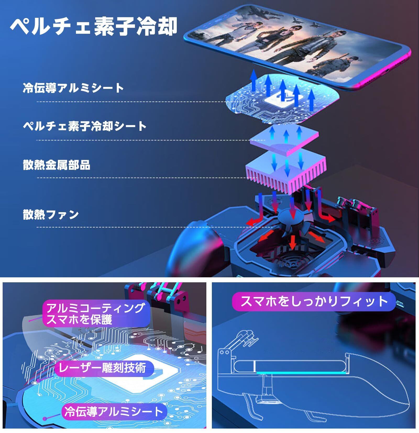 【ペルチェ素子冷却搭載】このスマホ用コントローラーはペルチェ素子(半導体)冷却方法を採用し、効率的に熱を吸い取り、発熱による急に画面が暗くなることや連続異常の問題は解決されます。冷伝導しやすいアルミシートでスマホは30秒以内に5℃を下がります。低温はスマホの電池を保護し、電池の寿命を延ばすことができます。