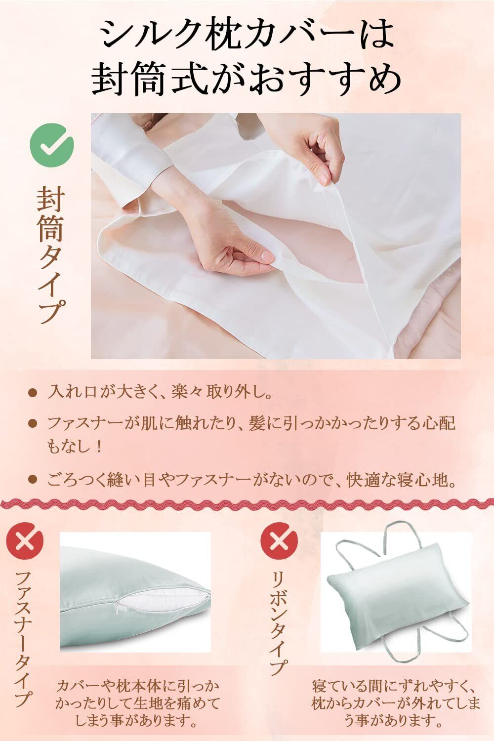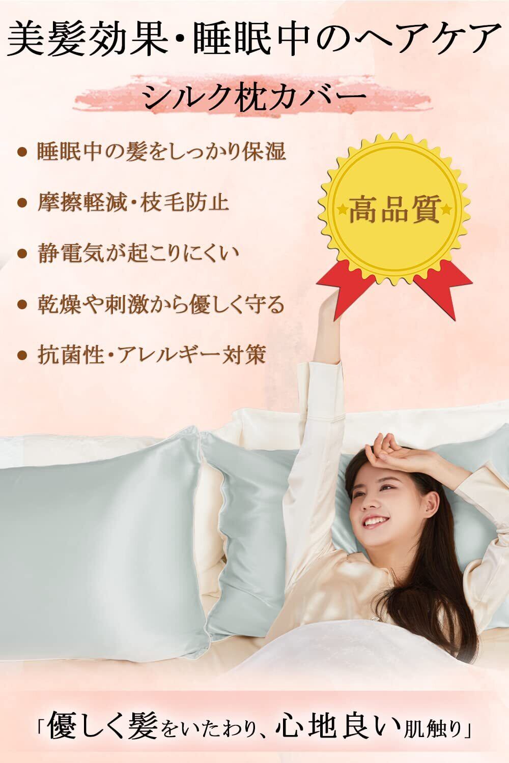 【美髪効果・睡眠中のヘアケア】人は1日に寝返りを20~30回も打つと言われてます。寝返りで髪同士が擦れると、切れ毛・枝毛の原因となります。シルク枕カバーは就寝時に髪の毛の絡まりを防ぐ効果があり、乾燥や寝返りで起こる髪の摩擦によるダメージを最小限に抑え、翌朝には髪の毛がいつもよりサラサラに!シルク枕カバーを日常的に使うことで髪質改善も期待できます。