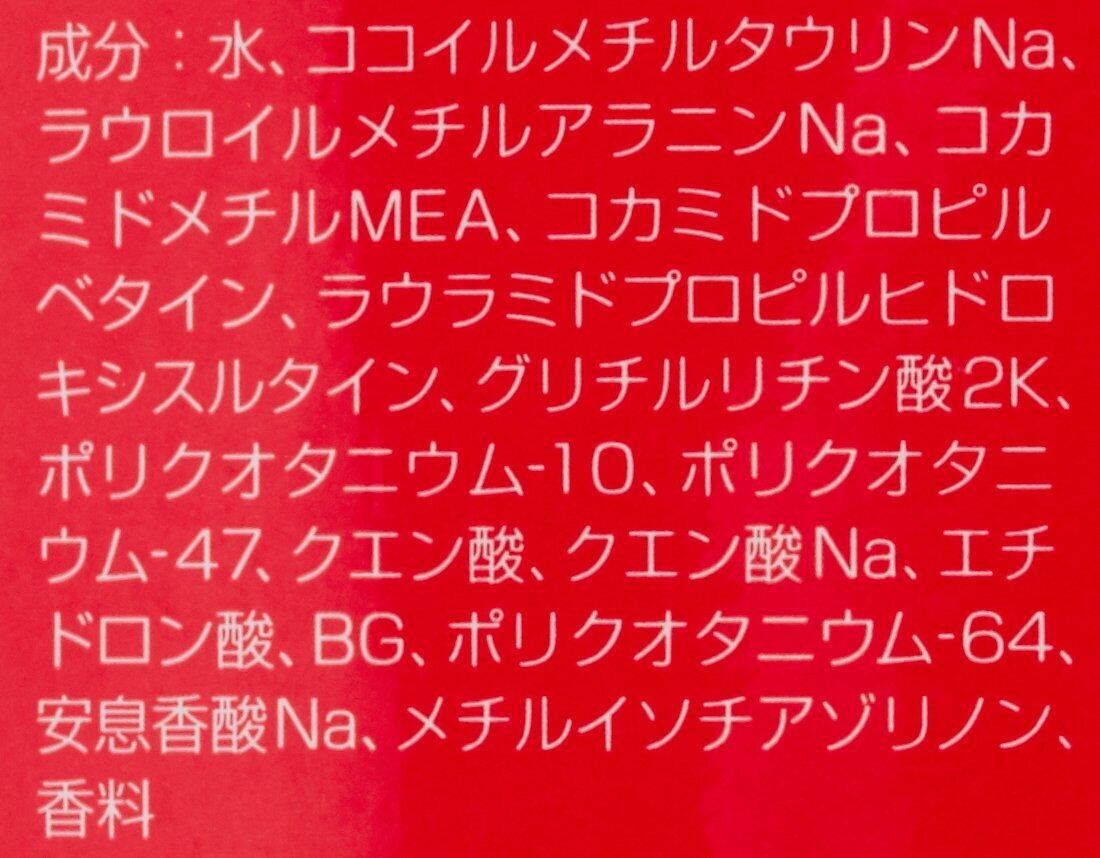 水、ココイルメチルタウリンNa、コカミドメチルMEA、コカミドプロピルベタイン、ラウラミドプロピルヒドロキシスルタイン、グリチルリシン酸2K、ポリクオタニウム-10、ポリクオタニウム-47、クエン酸、クエン酸Na、エチドロン酸、BG、ポリクオタニウム-64、NAGA、安息香酸Na、メチルイソチアゾリノン、香料